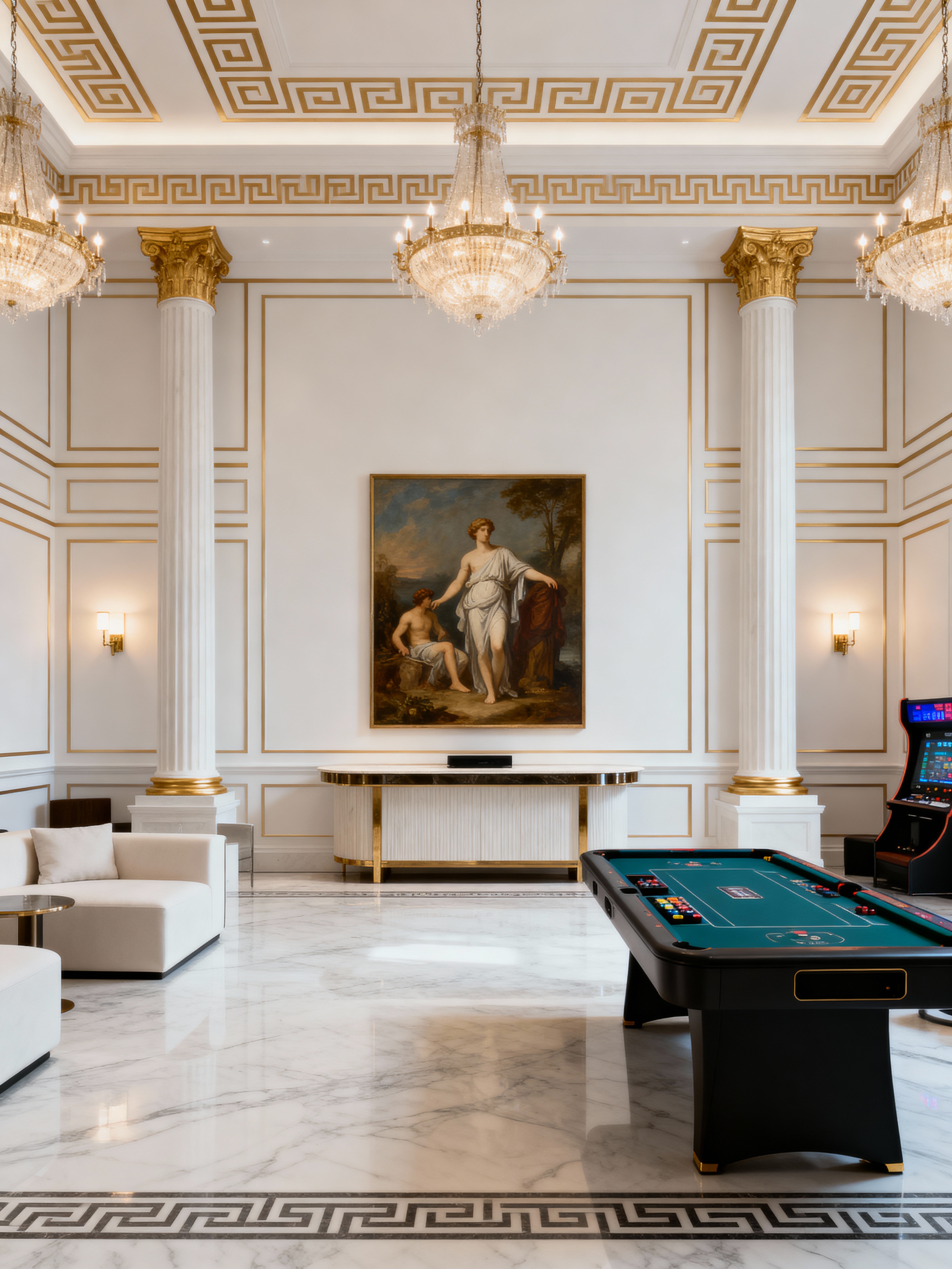 gaming room with neoclassic style . with high ceilings and timeless artwork and geometric decorative elements and emphasized horizontal and vertical lines and elegant and sophisticated and thoughtful minimalism and symmetric layouts and greek columns