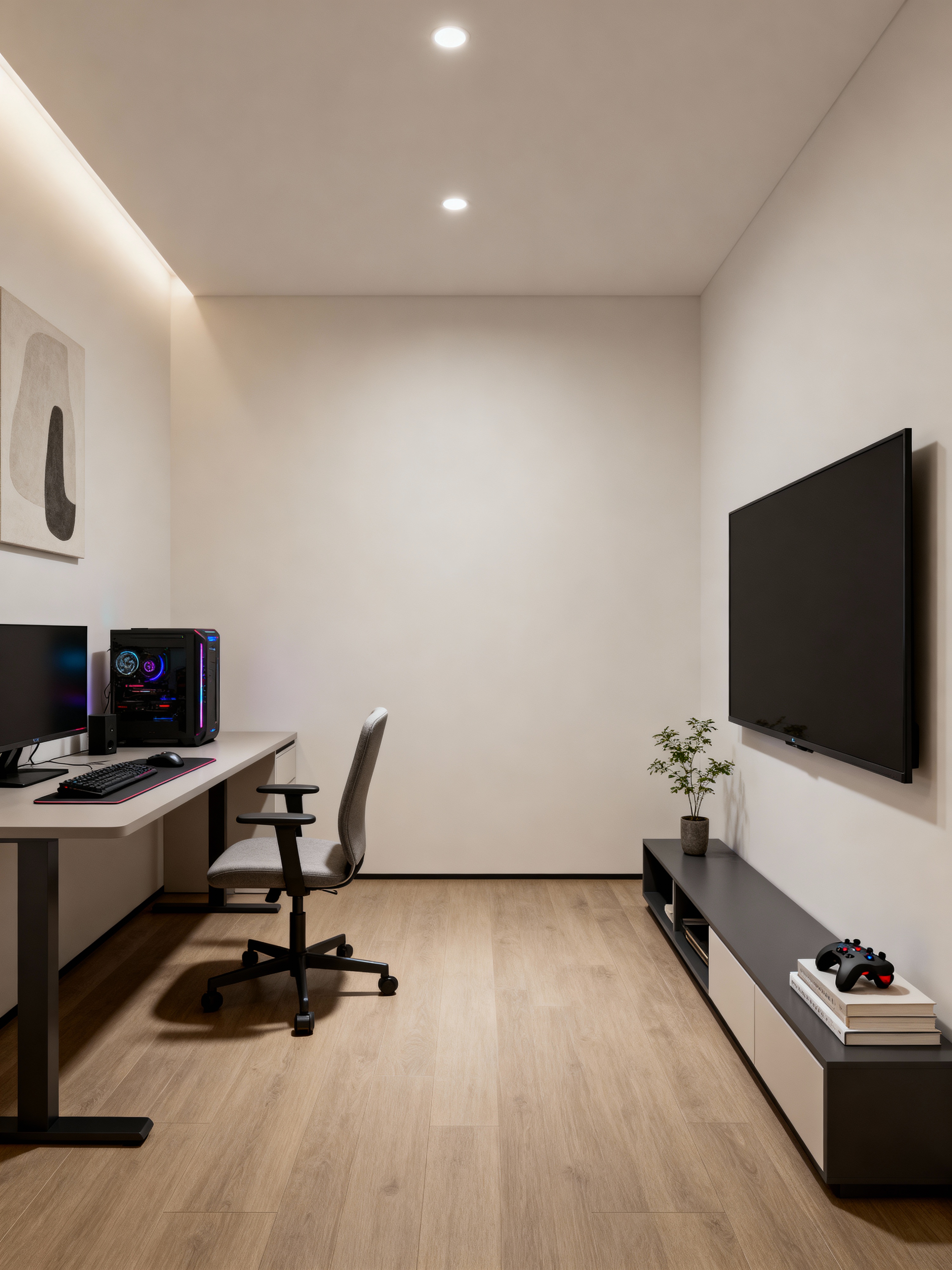 gaming room with simple style . with streamlined look and understated style and clean design and essential pieces and uncluttered space and neutral colors and basic elements and minimal decor