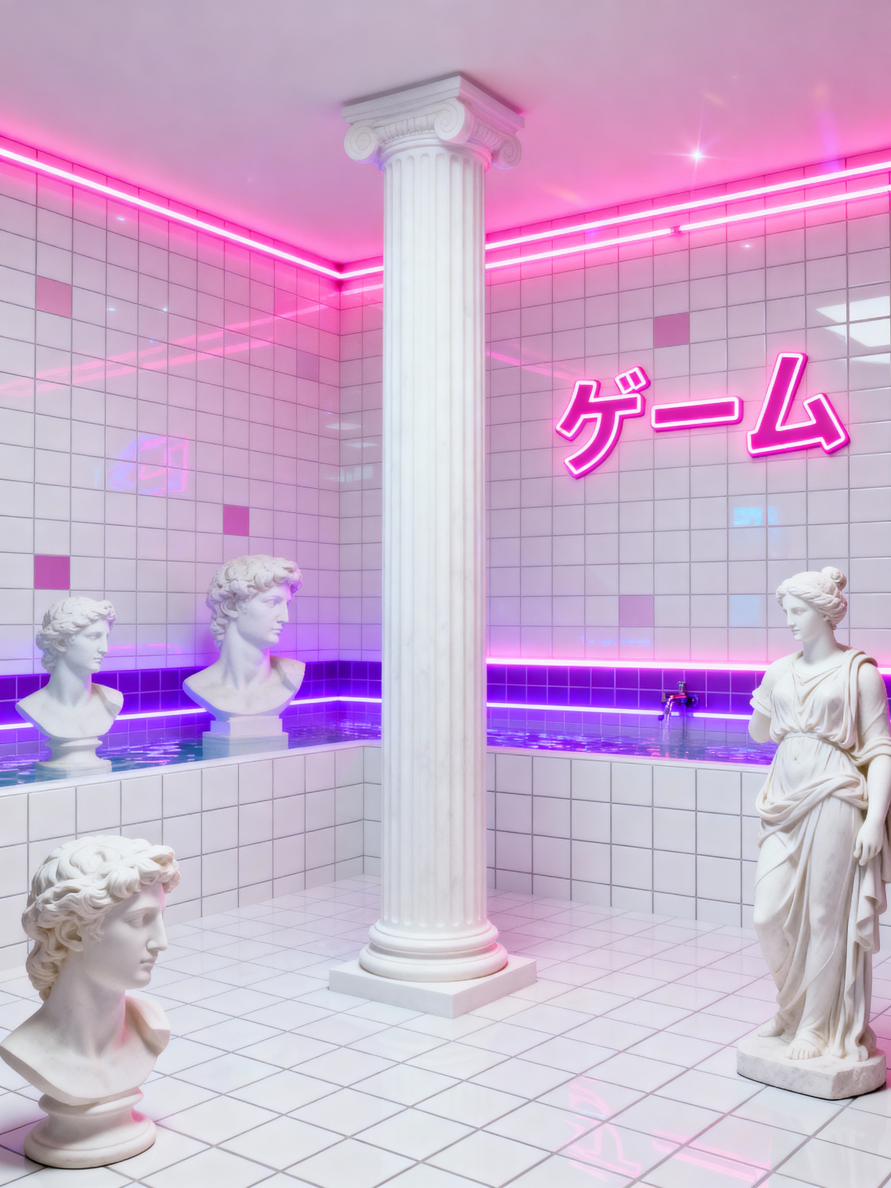 gaming room with vaporwave style . with white roman statues, white roman sculptures, white roman columns, white roman pillars in the center of the room, and white square bath tiles and white square bath tiles and bright pink and neon glow and purple lights and japanese letters on wall and white square bath tiles