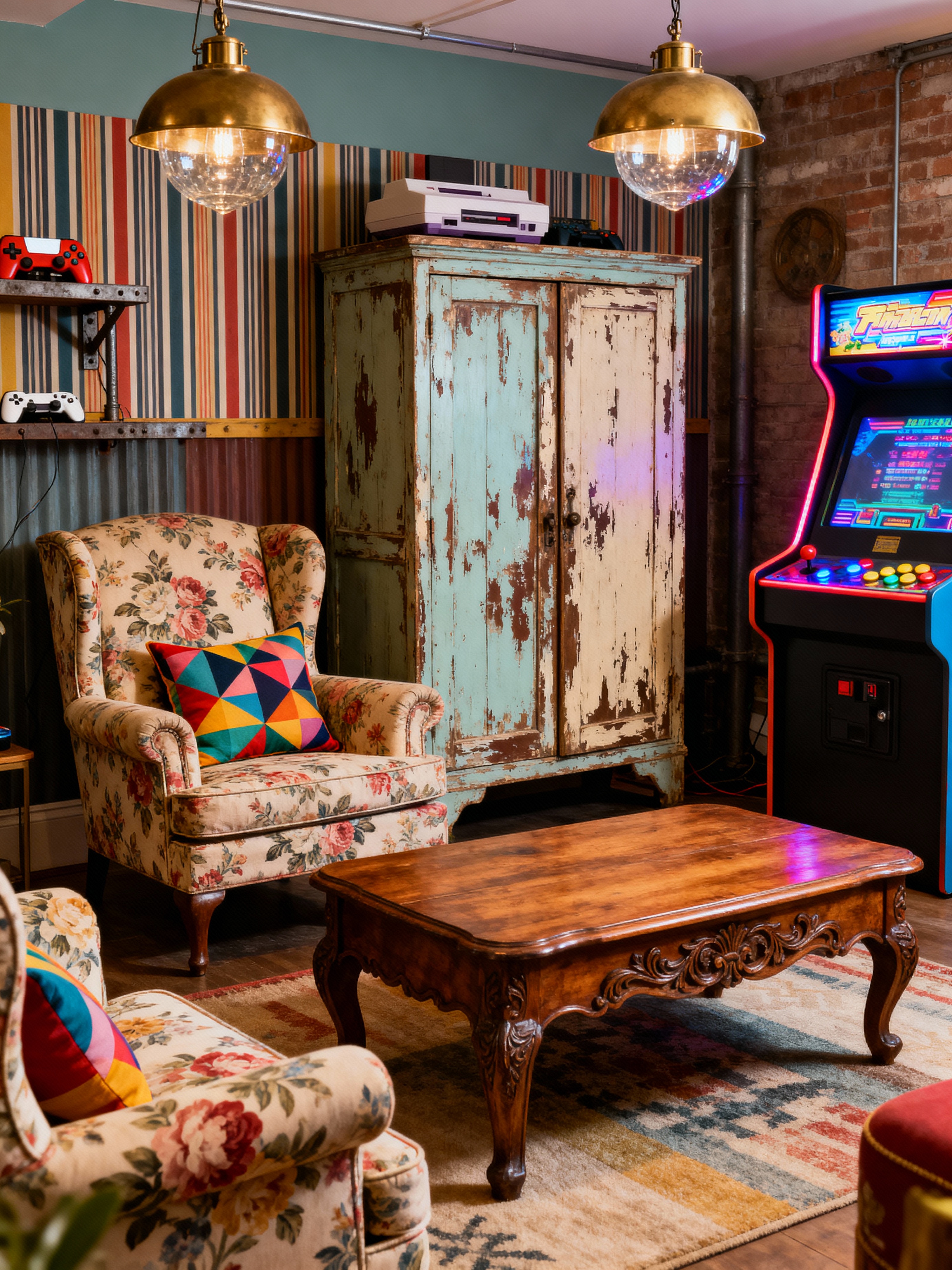 gaming room with vintage style . with retro style and mid-century and eclectic and upcycled furniture and antique decor and shabby chic and colorful accents and ornate details