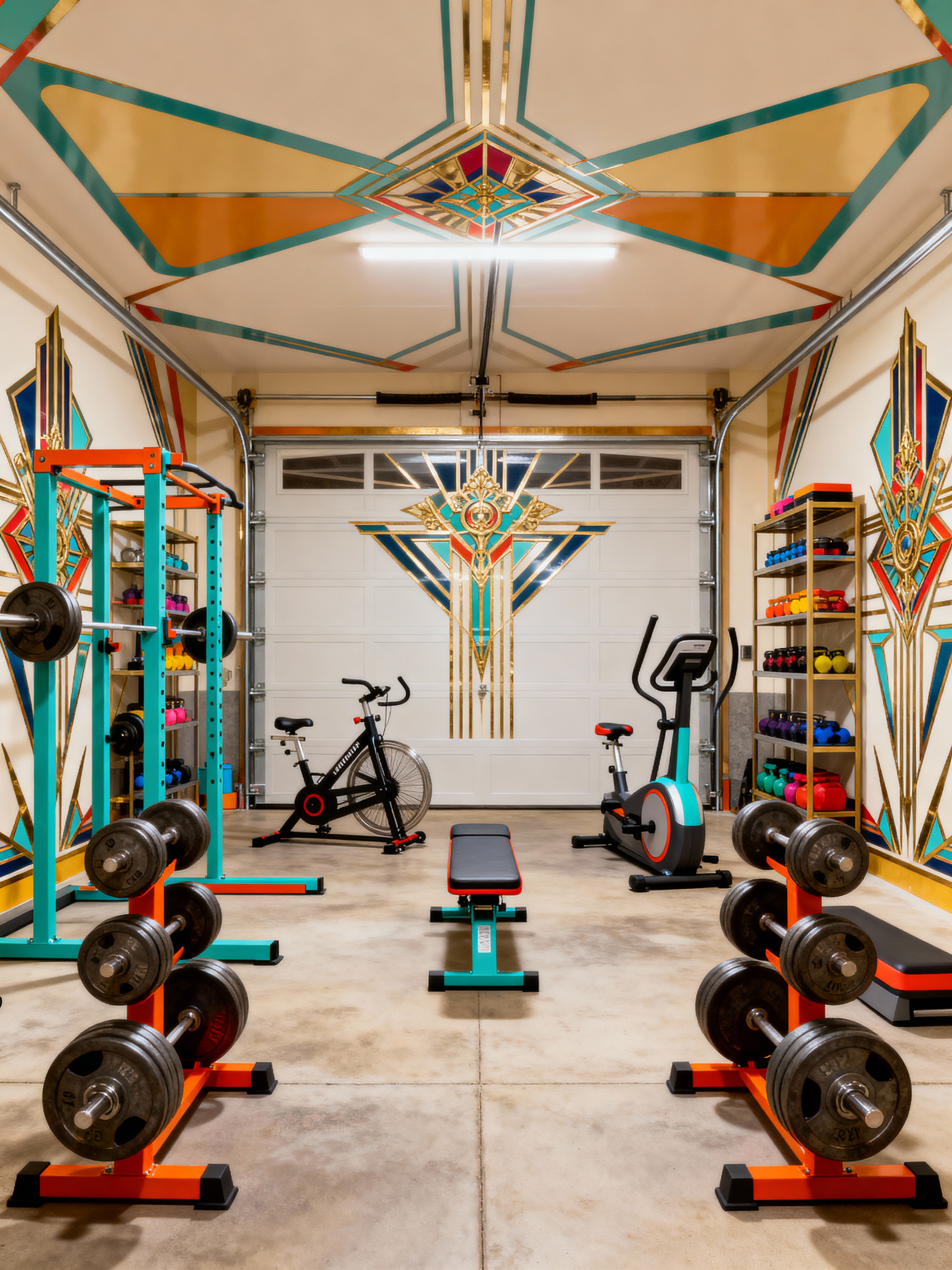 garage gym with art deco style with dumbbell stand and squat rack and exercise bicycle and bench press and crosstrainer and garage gym and storage racks and dumbbell stand. . with bright and cheerful colors and symmetrical designs and abstract patterns and stream-lined forms and rich colors and decadent detail and exuberant shapes and angular shapes