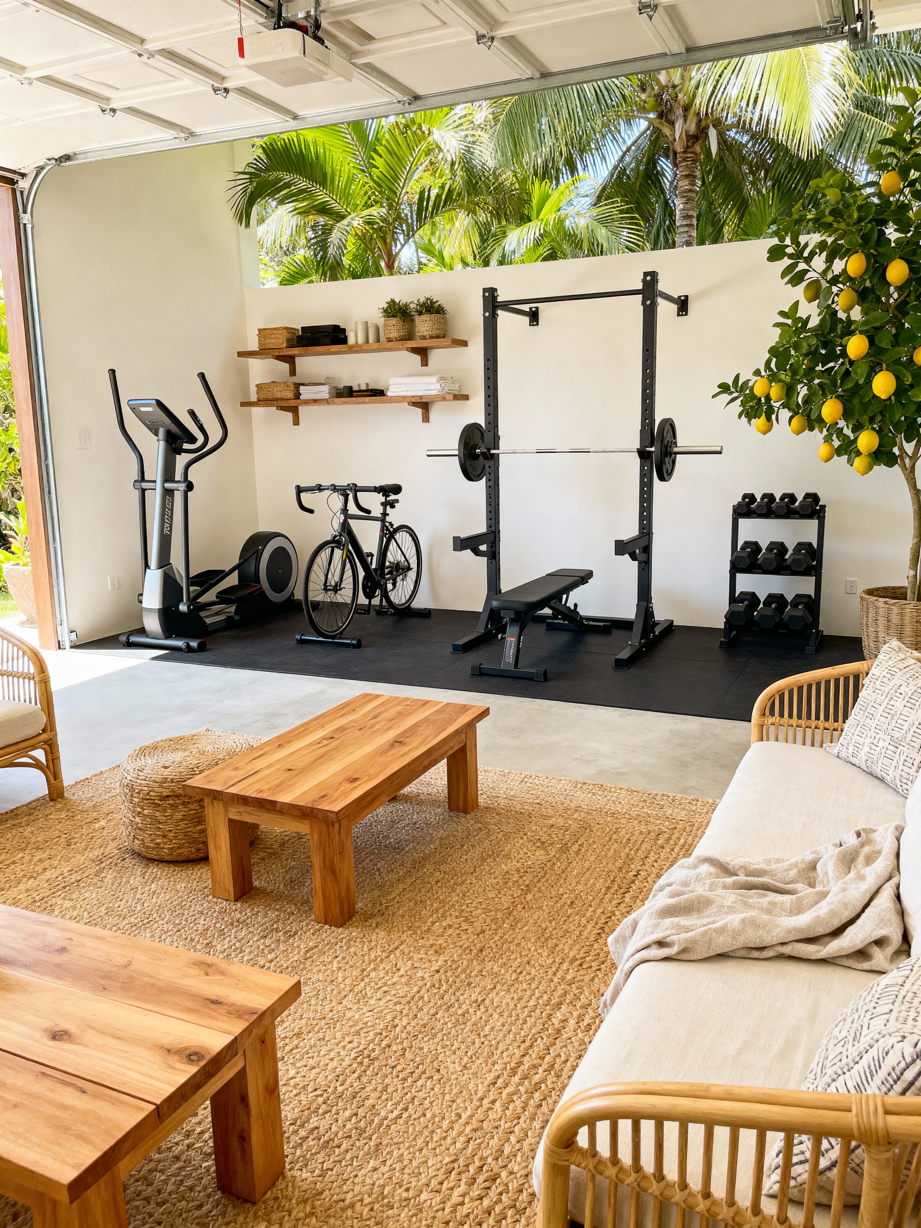 garage gym with bali style with garage gym and crosstrainer and exercise bicycle and storage racks and squat rack and bench press and dumbbell stand and garage gym. . with woven rugs (jute, seagrass) and lush tropical plants (palms, lemon trees) and white or cream walls and rattan chairs and decor and linen or cotton fabrics and neutral color palette and light wood furniture (teak, oak) and wooden coffee and dining tables