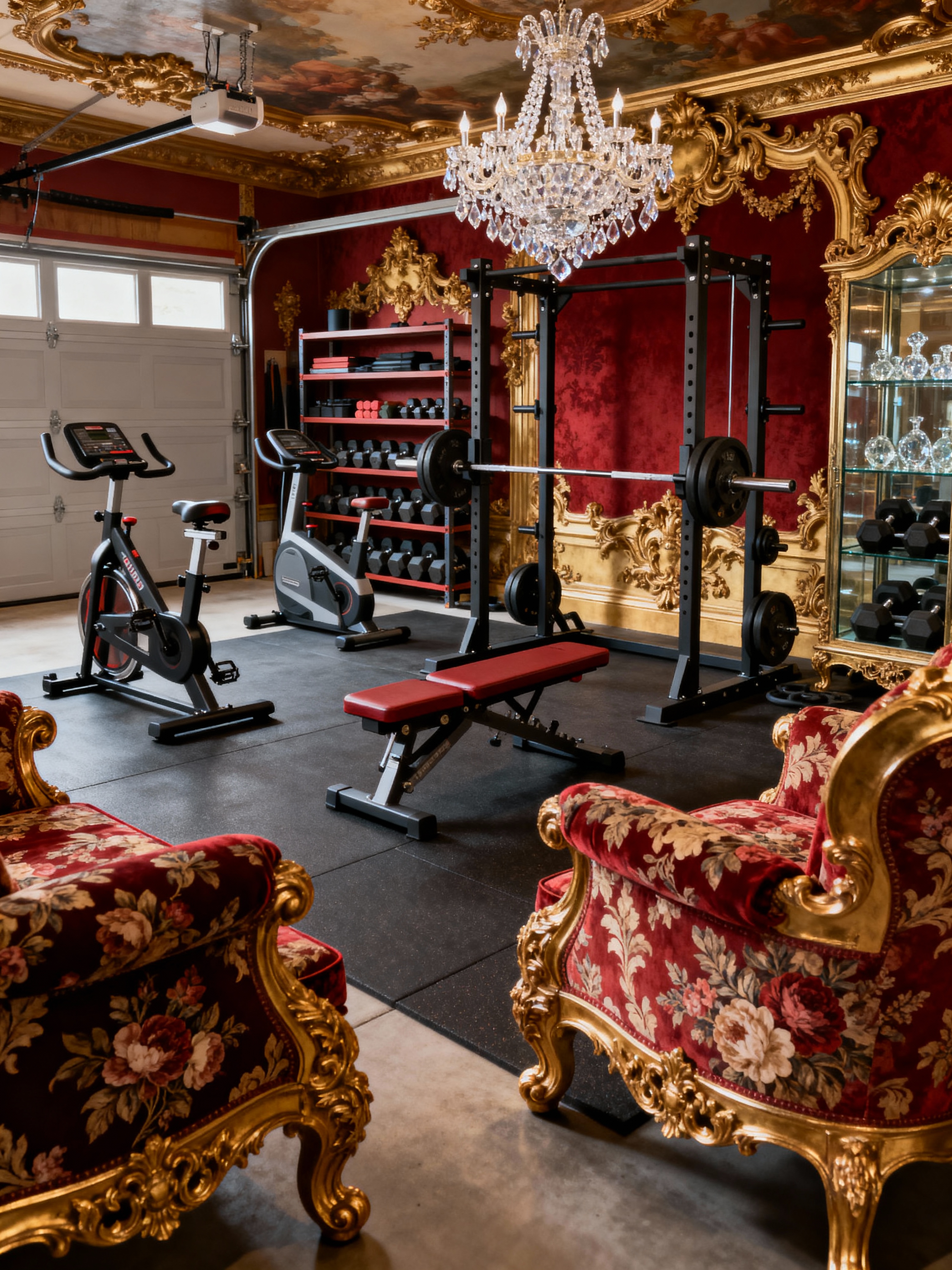 garage gym with baroque style with exercise bicycle and bench press and dumbbell stand and garage gym and storage racks and crosstrainer and squat rack and exercise bicycle. . with crystal and glass accents and emotional exuberance and opulent and colossal furniture and grandeur and tension and movement and intricate carvings and ornaments and luxurious floral and damask fabrics
