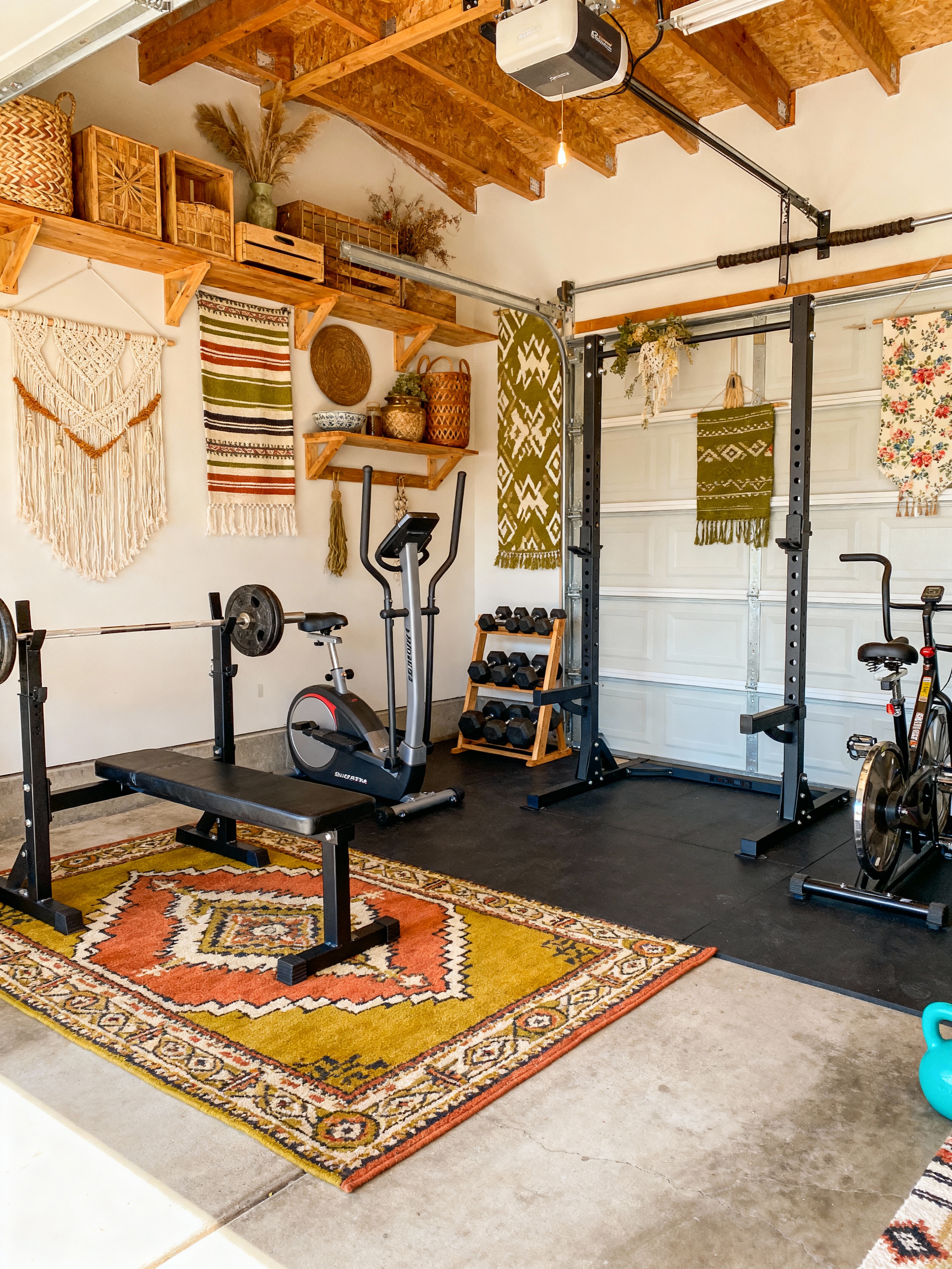 garage gym with boho-chic style with bench press and crosstrainer and squat rack and dumbbell stand and exercise bicycle and garage gym and storage racks and bench press. . with vintage finds and mixed patterns and natural materials and free-spirited and bohemian flair and layered textiles and eclectic mix and earthy colors