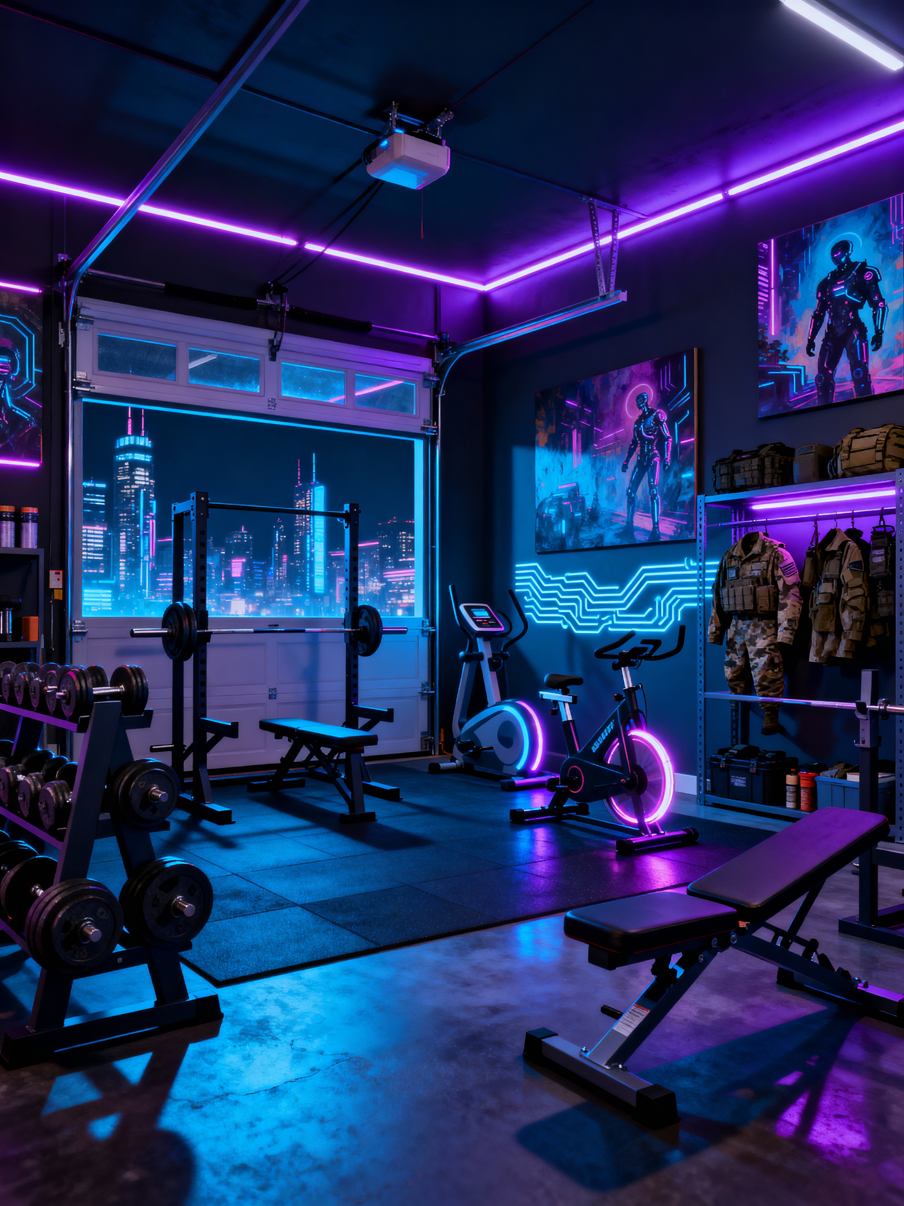 garage gym with cyberpunk style with dumbbell stand and garage gym and squat rack and crosstrainer and storage racks and exercise bicycle and bench press and dumbbell stand. . with bladerunner lights and surrealist paintings and cyberpunk style and dark night and futuristic cybernetic city and cyberpunk lights and military uniforms and gear and futuristic cybernetic details
