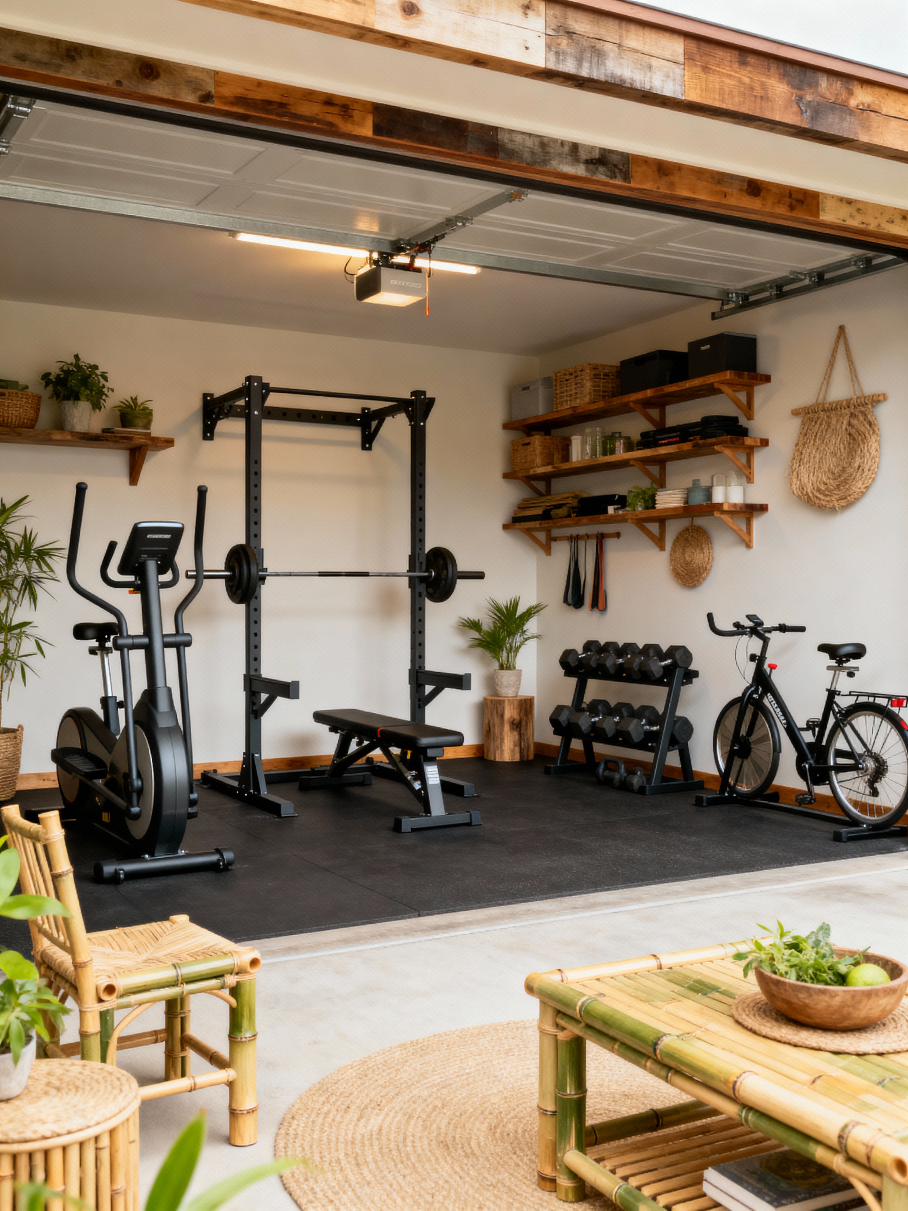 garage gym with eco-friendly style with crosstrainer and squat rack and storage racks and bench press and dumbbell stand and exercise bicycle and garage gym and crosstrainer. . with recycled elements and organic textiles and non-toxic finishes and sustainable materials and environmentally conscious and bamboo furniture and reclaimed wood and natural fibers
