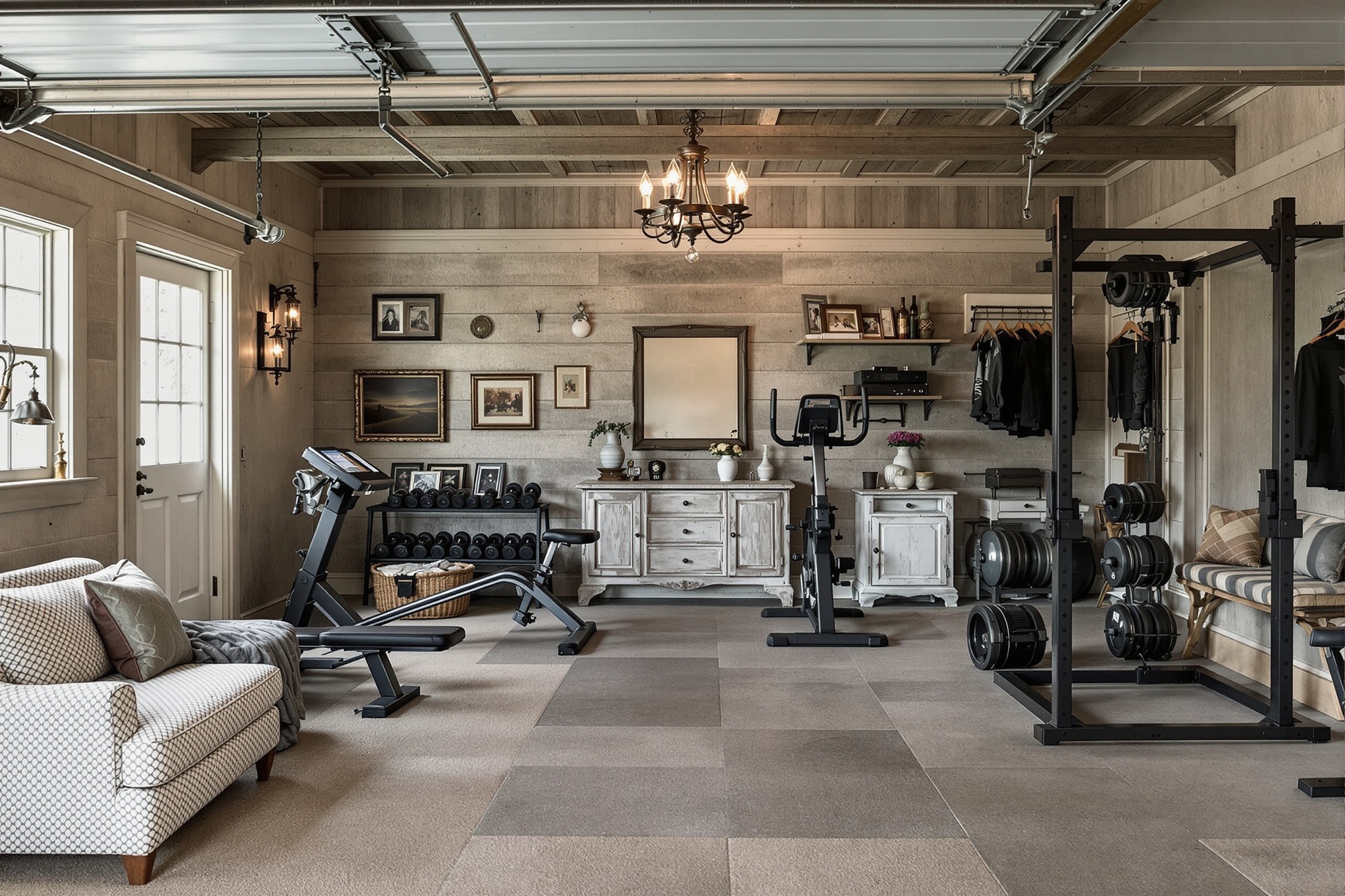 garage gym with french country style with crosstrainer and dumbbell stand and squat rack and garage gym and storage racks and bench press and exercise bicycle and crosstrainer. . with distressed wood and chandeliers and country elegance and soft fabrics and textured walls and warm tones and vintage furniture and antique decor