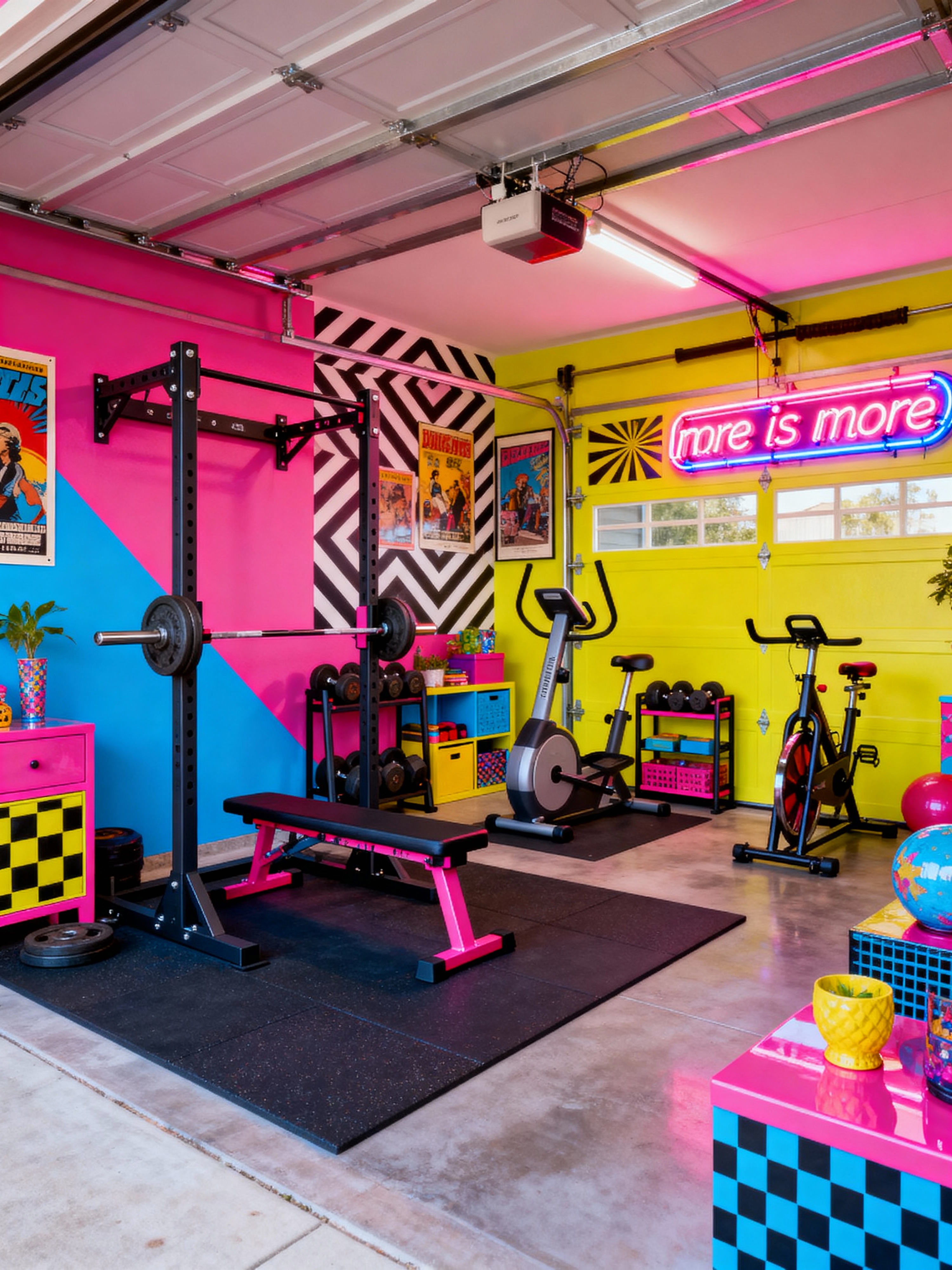 garage gym with maximalist style with squat rack and crosstrainer and dumbbell stand and bench press and garage gym and storage racks and exercise bicycle and squat rack. . with vibrant and eye-catching and playful and bold design and more is more philosophy and bold creativity and bold colors and over-the-top aesthetic