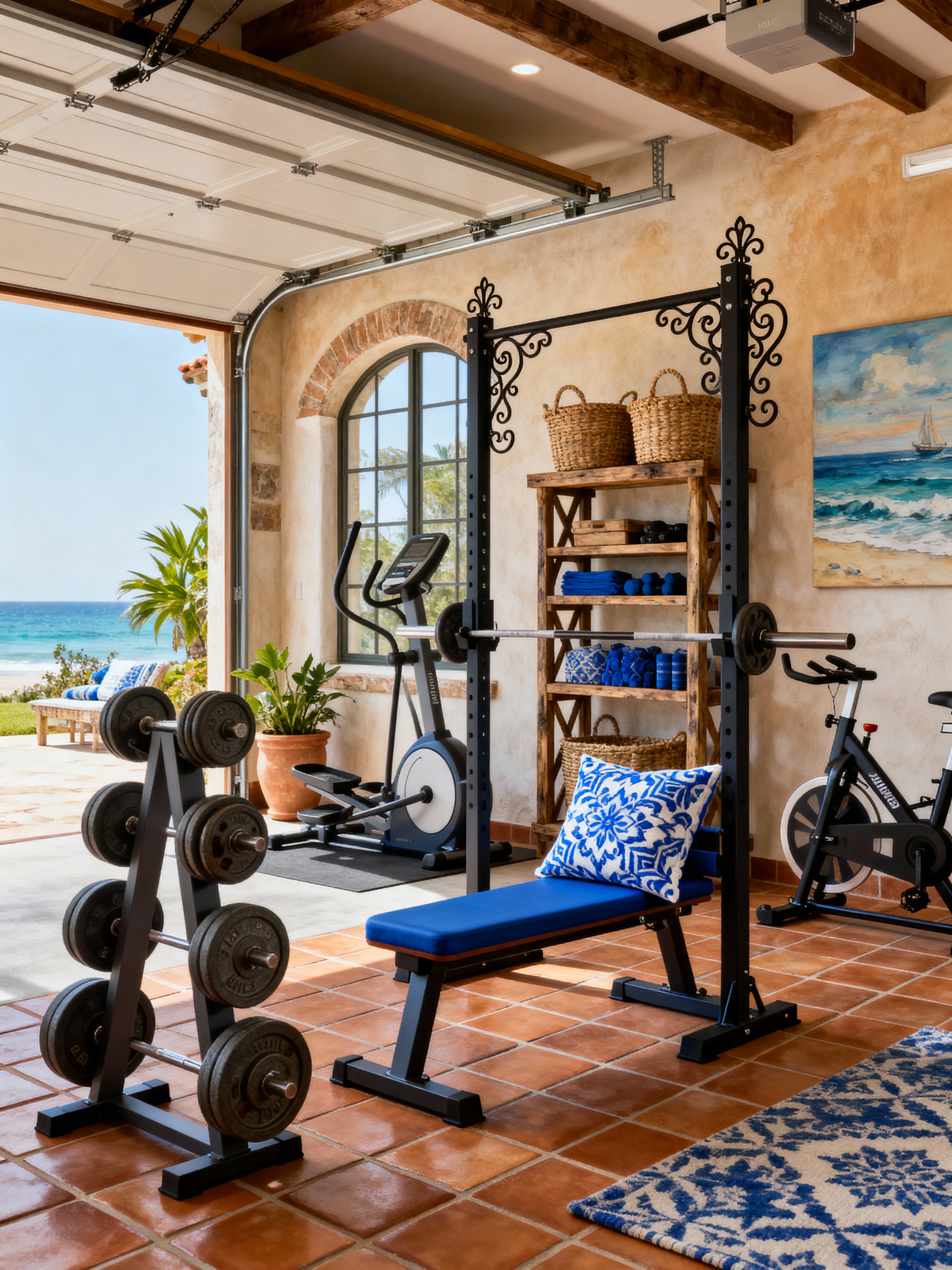 garage gym with mediterranean style with dumbbell stand and bench press and squat rack and crosstrainer and storage racks and exercise bicycle and garage gym and dumbbell stand. . with sun-drenched and rustic charm and coastal influence and outdoor living and blue and white and wrought iron and terracotta tiles and warm earth tones