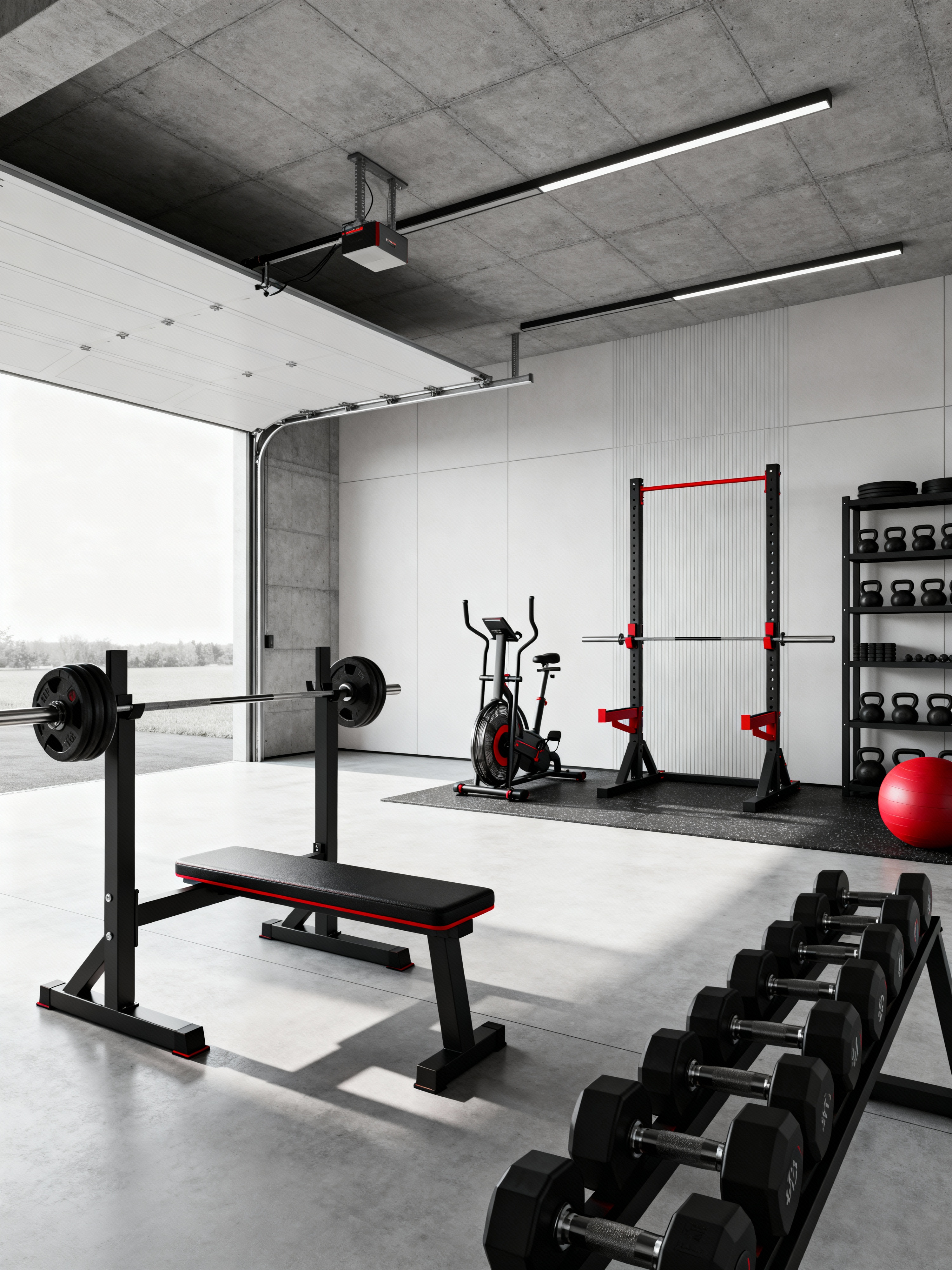 garage gym with minimalist style with bench press and exercise bicycle and dumbbell stand and garage gym and crosstrainer and squat rack and storage racks and bench press. . with lots of light and a monochromatic palette with colour used as an accent and functional furniture and an open floor plan and clean lines and focus on the shape, colour and texture of just a few of essential elements and lots of light