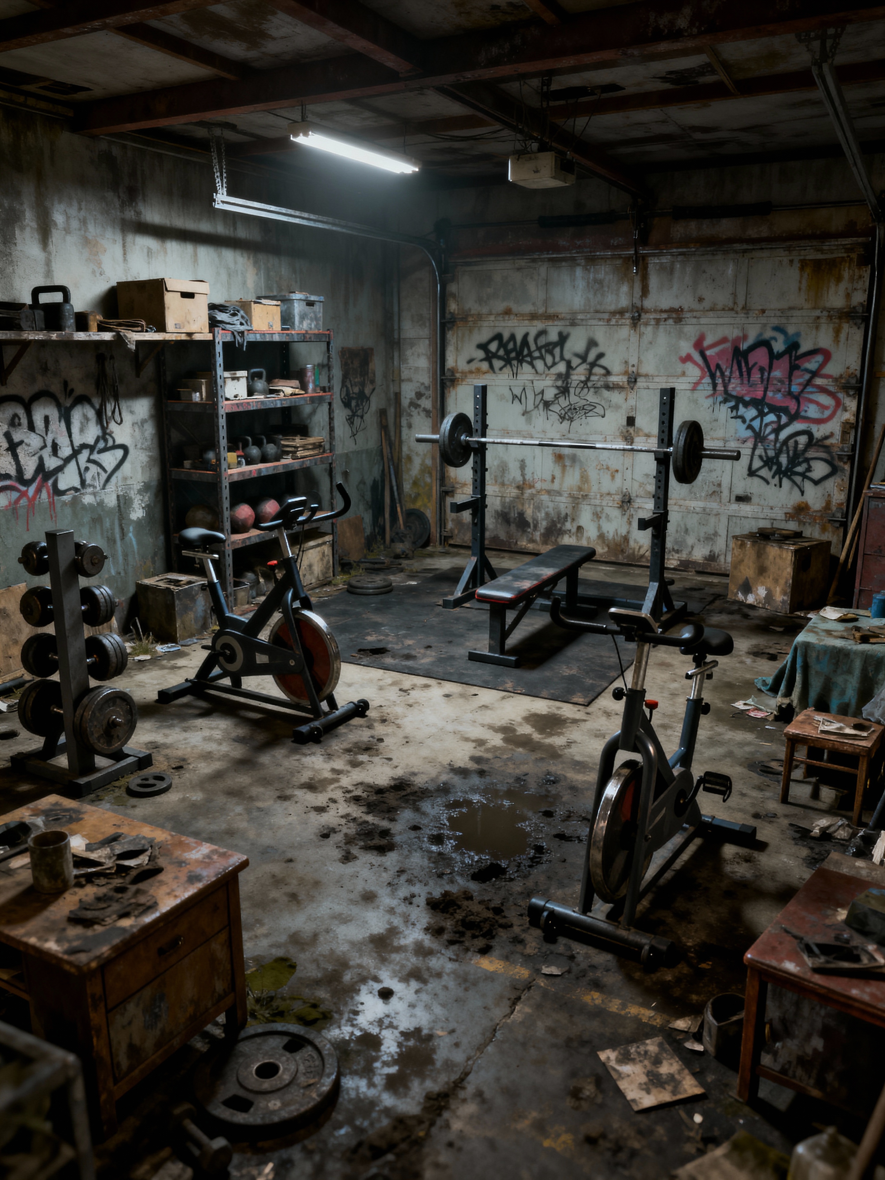 garage gym with post-apocalyptic style with storage racks and dumbbell stand and garage gym and exercise bicycle and bench press and squat rack and crosstrainer and storage racks. . with industrial elements and weathered materials and graffiti on walls and makeshift furniture and clutter and desolate and survival-inspired and dirty floor