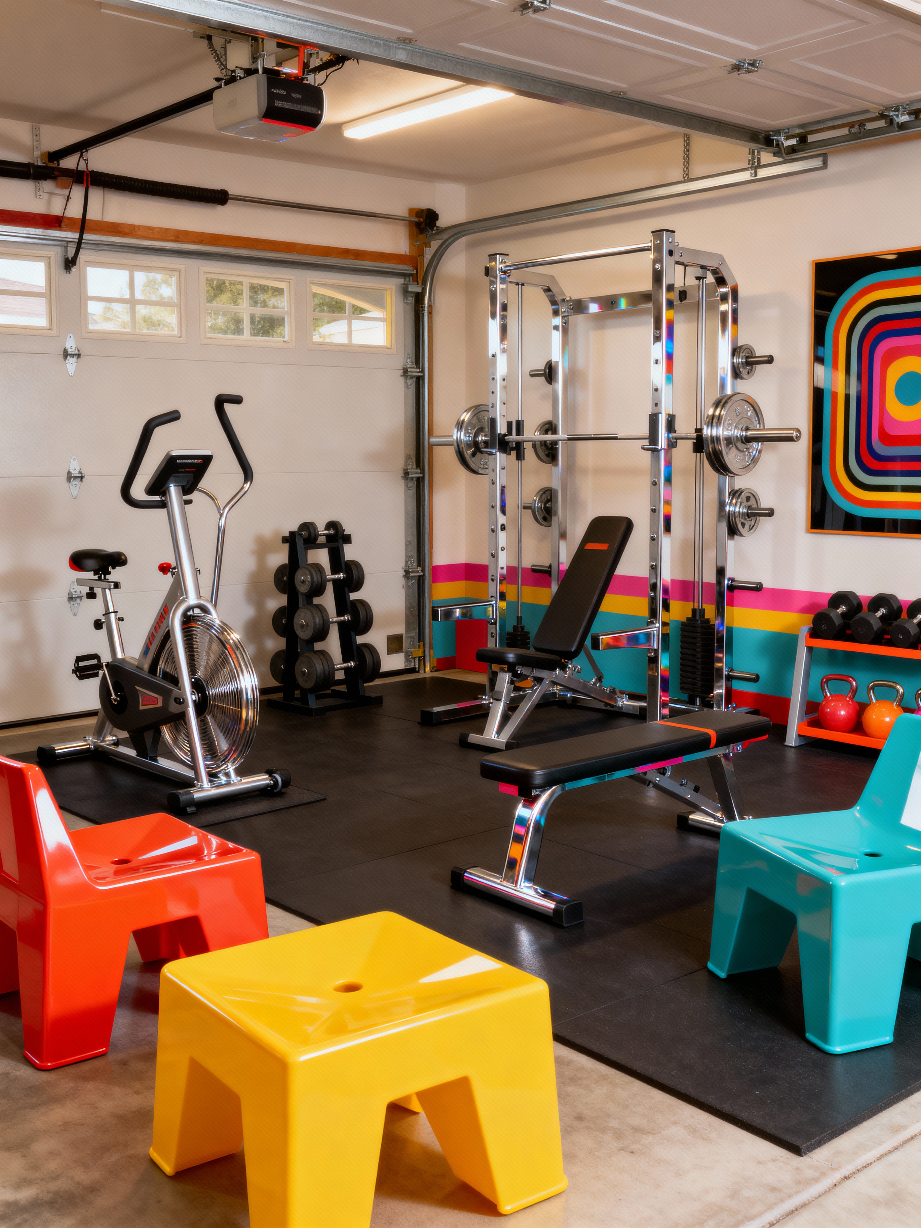 garage gym with retro style with crosstrainer and storage racks and exercise bicycle and squat rack and dumbbell stand and bench press and garage gym and crosstrainer. . with chrome accents and groovy vibes and space age and bright colors and plastic furniture and geometric shapes and nostalgic pieces and funky decor