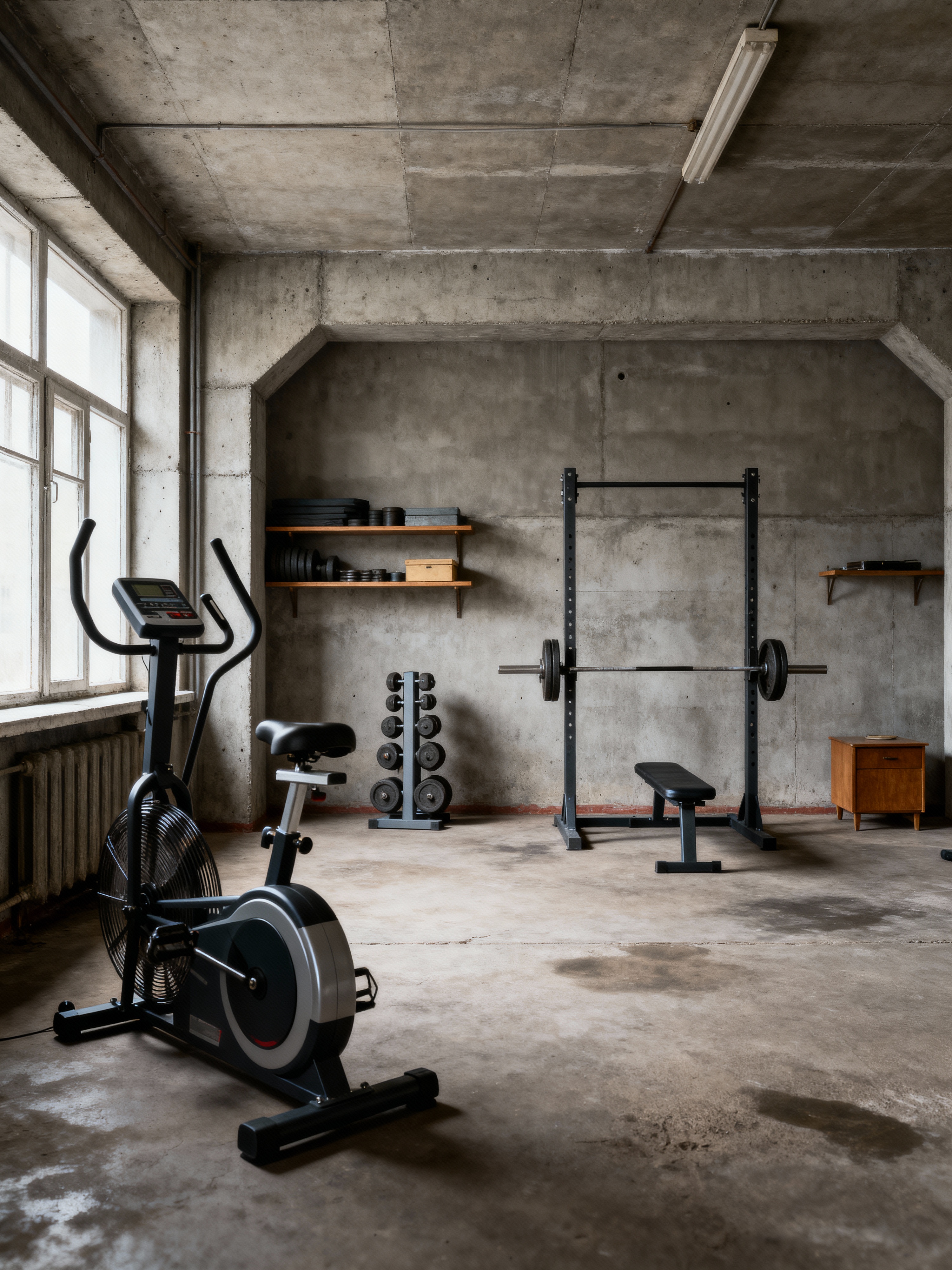 garage gym with soviet style with crosstrainer and garage gym and exercise bicycle and storage racks and dumbbell stand and squat rack and bench press and crosstrainer. . with functional furniture and austere aesthetic and communist design and brutalist style and socialist realism and concrete structures and soviet-era architecture and utilitarian design