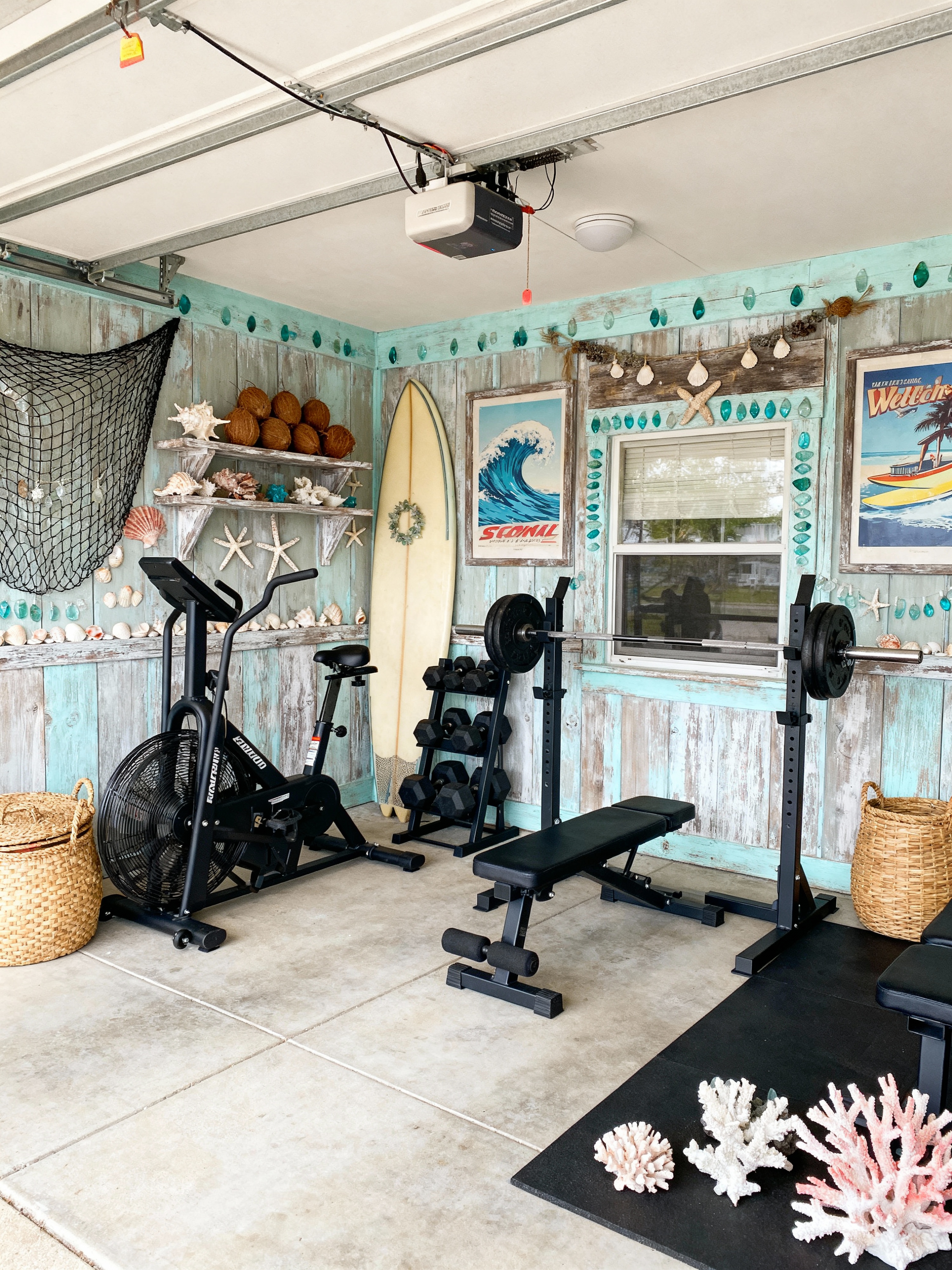 garage gym with surf shack style with crosstrainer and exercise bicycle and bench press and dumbbell stand and garage gym and storage racks and squat rack and crosstrainer. . with weathered wood and sea glass and seashells and net decorations and coconut decor and vintage surf posters and woven baskets and coral accents