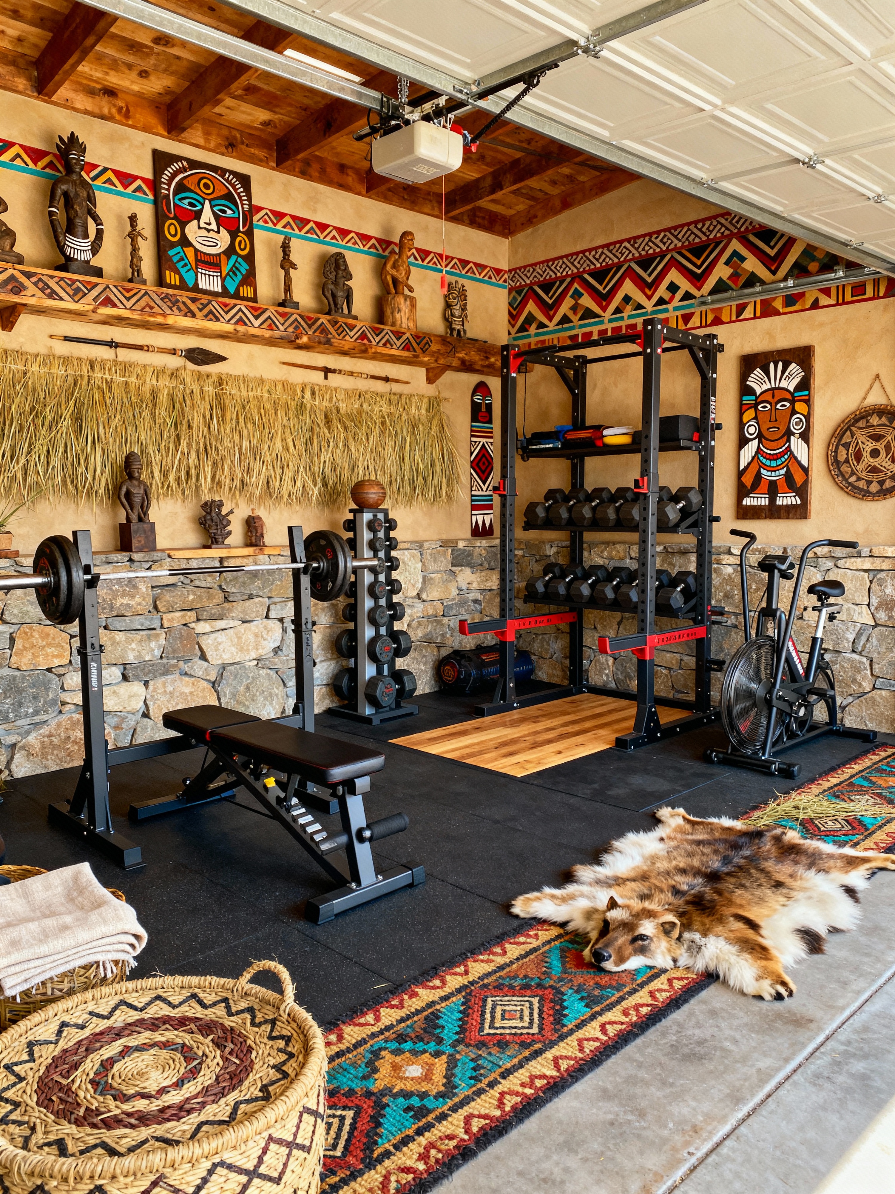 garage gym with tribal style with bench press and crosstrainer and exercise bicycle and dumbbell stand and storage racks and squat rack and garage gym and bench press. . with sculptures and artworks and tribal revival and animal furslinen and tribal patterns and intricate grass weaving and smooth worn timbers and exuberant splashes of colour and planks of stone