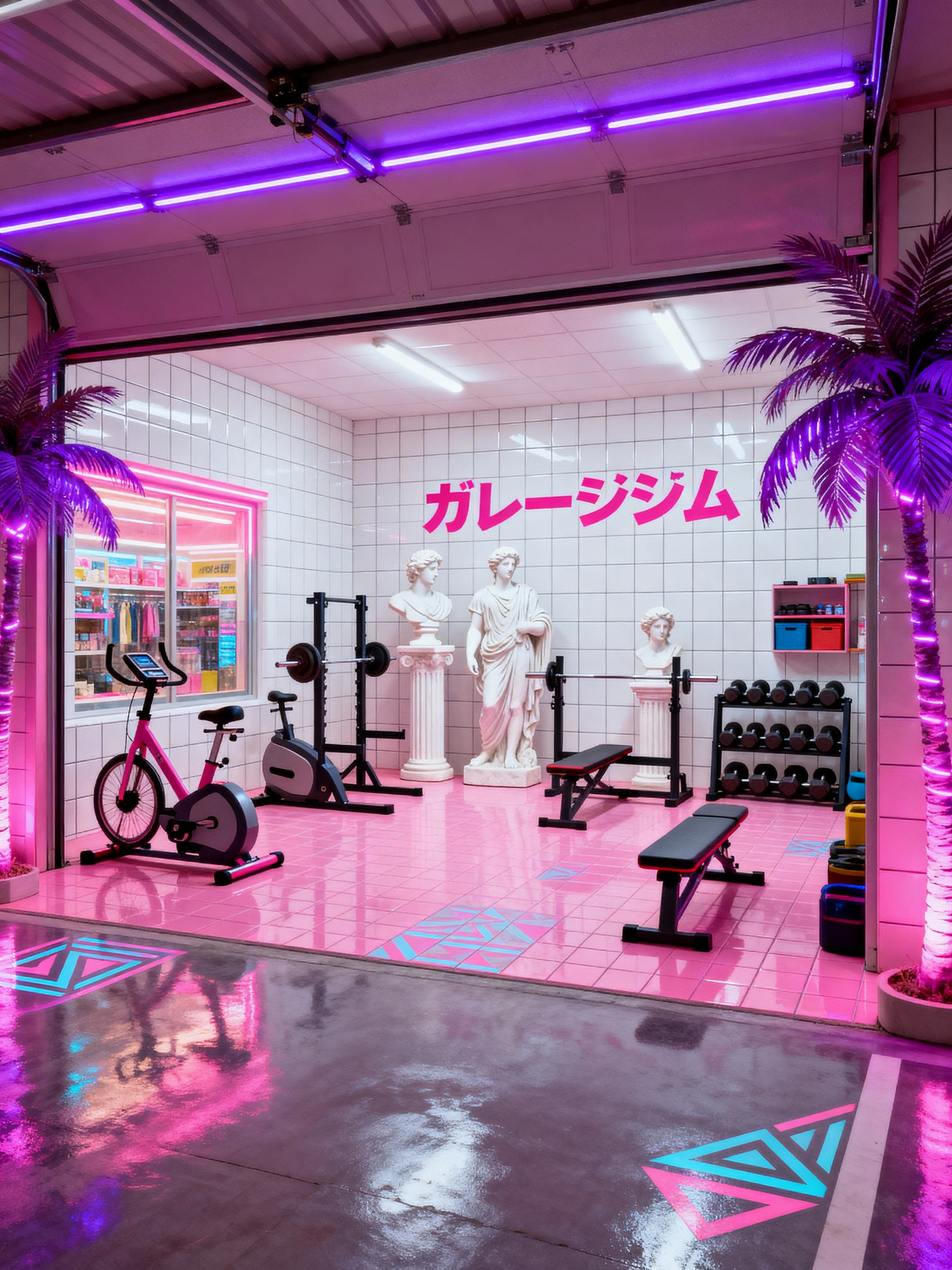 garage gym with vaporwave style with exercise bicycle and crosstrainer and squat rack and garage gym and dumbbell stand and bench press and storage racks and exercise bicycle. . with white square bathroom tiles and 1980s retail shops and japanese letters on wall and bright pink and white square bathroom tiles and white roman statues, white roman sculptures, white roman columns, white roman pillars in the center of the room, and palm trees and purple lights