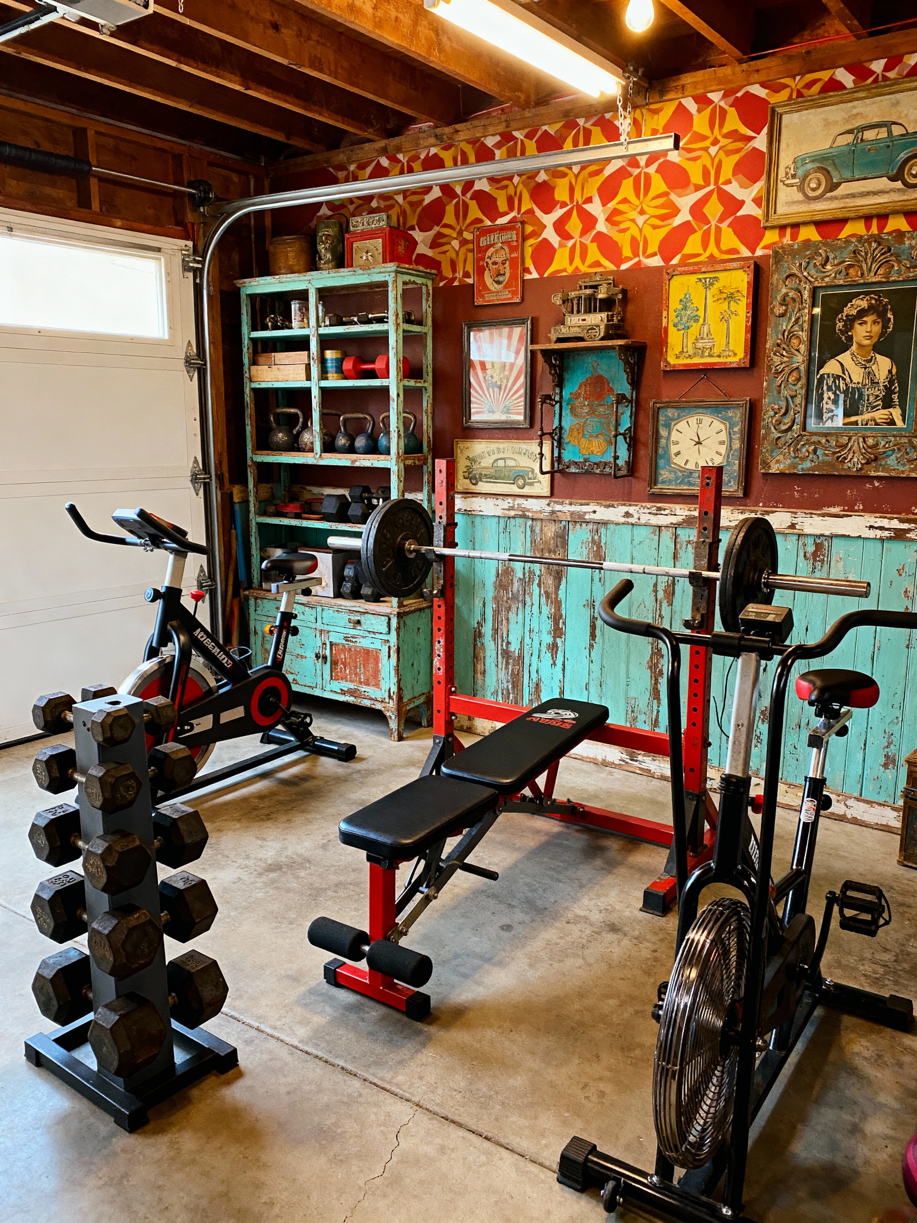 garage gym with vintage style with dumbbell stand and crosstrainer and bench press and garage gym and exercise bicycle and storage racks and squat rack and dumbbell stand. . with bold patterns and upcycled furniture and timeless pieces and colorful accents and eclectic and shabby chic and antique decor and retro style