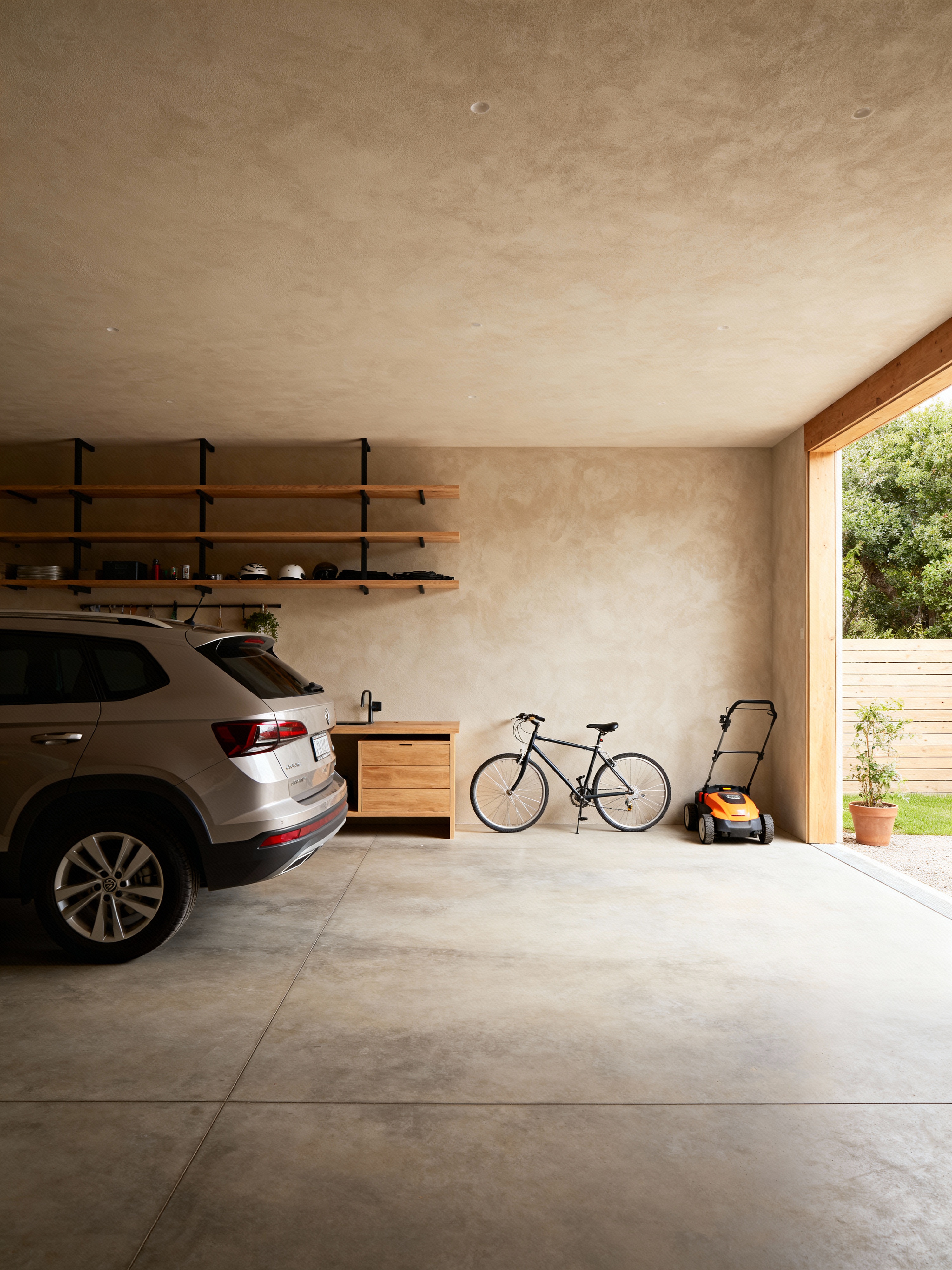 garage with airbnb style with lawnmower and concrete floor and storage racks and cars and bicycles and garage door and lawnmower. . with simple, clean lines and simplistic furniture and open and natural lighting and neutral walls and textures and scandinavian style and natural materials and elements and simple color palette and practicality and functionality and simple, clean lines and simplistic furniture