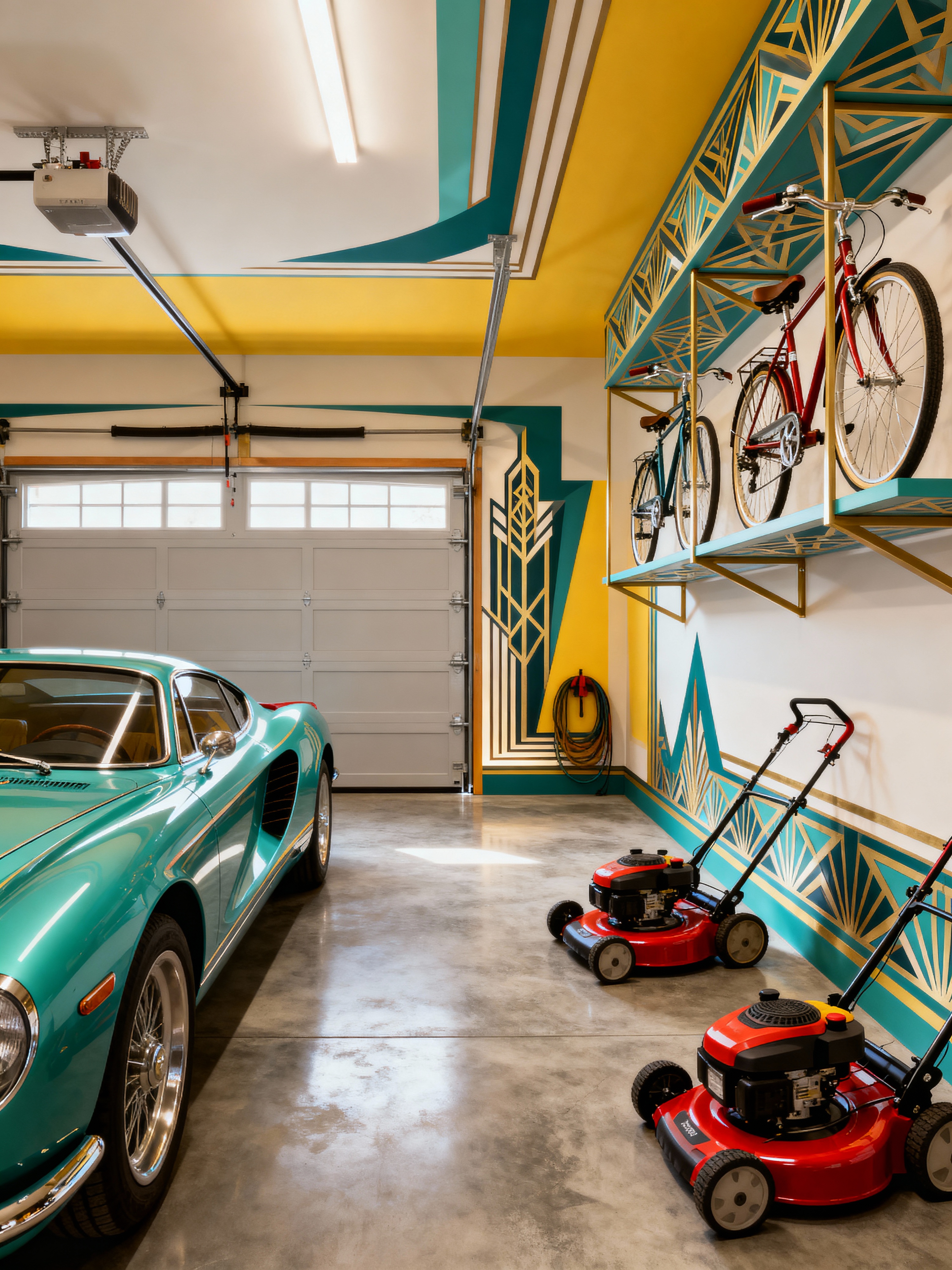 garage with art deco style with concrete floor and bicycles and storage racks and garage door and lawnmower and cars and concrete floor. . with bright and cheerful colors and exuberant shapes and rich colors and smooth lines and stream-lined forms and angular shapes and luxury and geometric lines