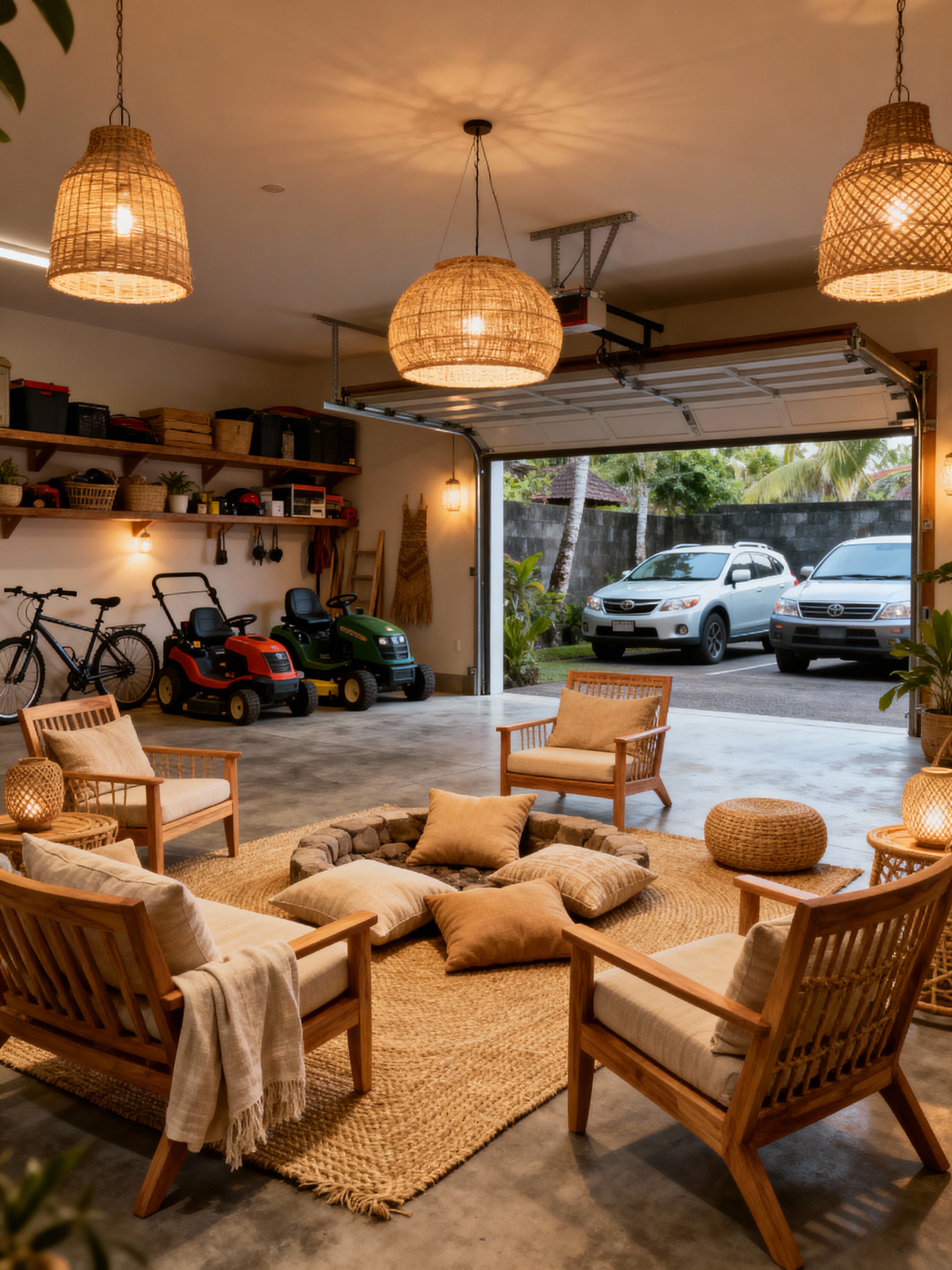 garage with bali style with cars and concrete floor and storage racks and garage door and bicycles and lawnmower and cars. . with light wood furniture (teak, oak) and woven rugs (jute, seagrass) and beige and sand tone cushions and linen or cotton fabrics and woven pendant lamps and rattan chairs and decor and warm ambient lighting and conversation pit with pillows
