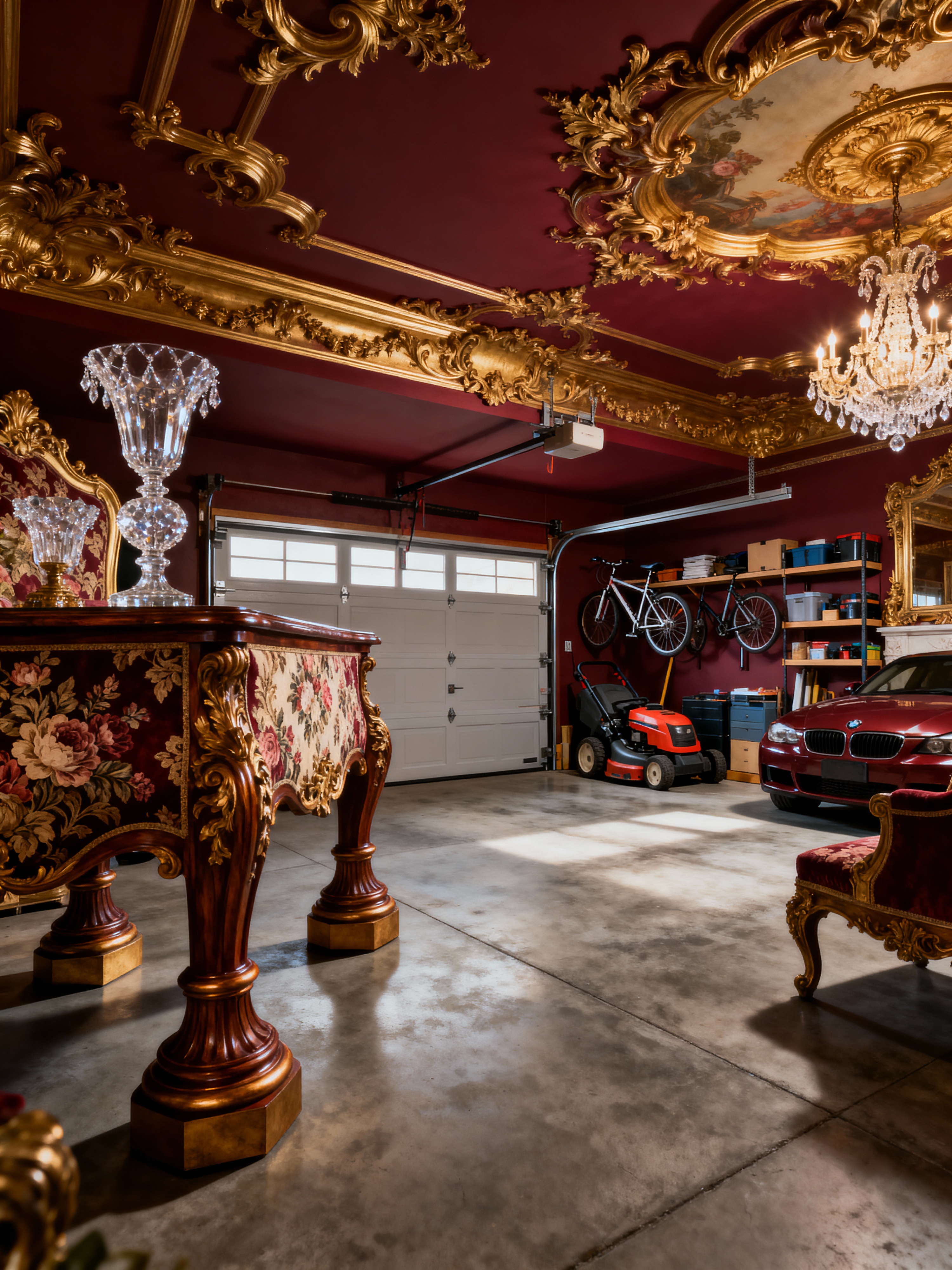 garage with baroque style with storage racks and garage door and bicycles and lawnmower and cars and concrete floor and storage racks. . with sensuous richness and grandeur and tension and pedestal feet and drama and opulent and colossal furniture and luxurious floral and damask fabrics and crystal and glass accents