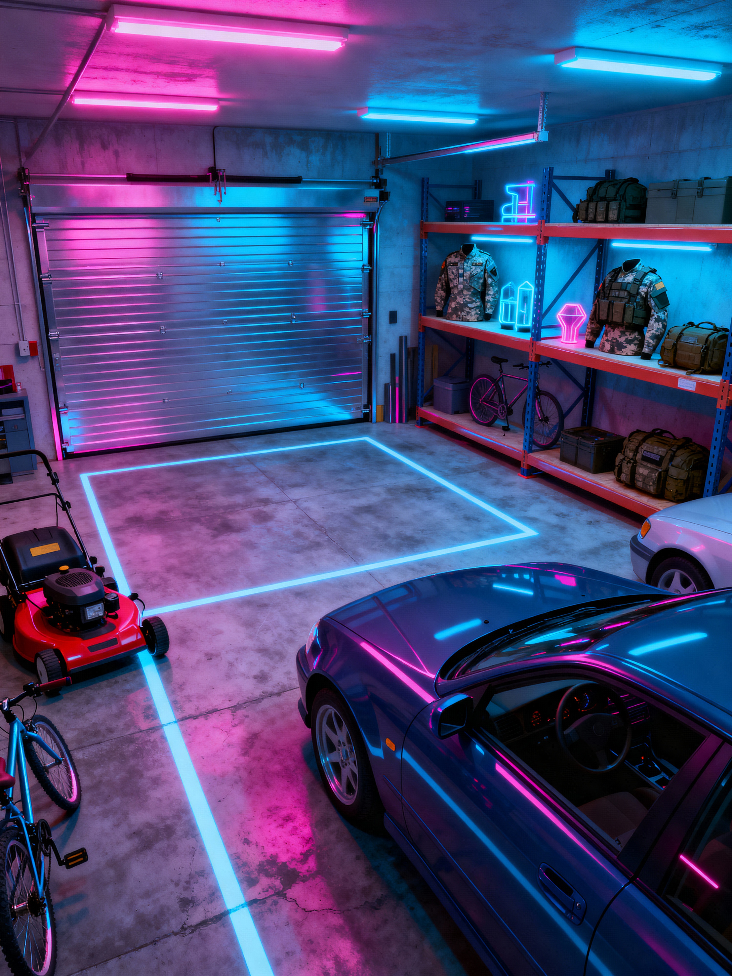garage with cyberpunk style with lawnmower and cars and bicycles and garage door and concrete floor and storage racks and lawnmower. . with bladerunner lights and synthwave and cyberpunk lights and synthetic objects and cyberpunk style and clean straight square lines and military uniforms and gear and cyberpunk lights