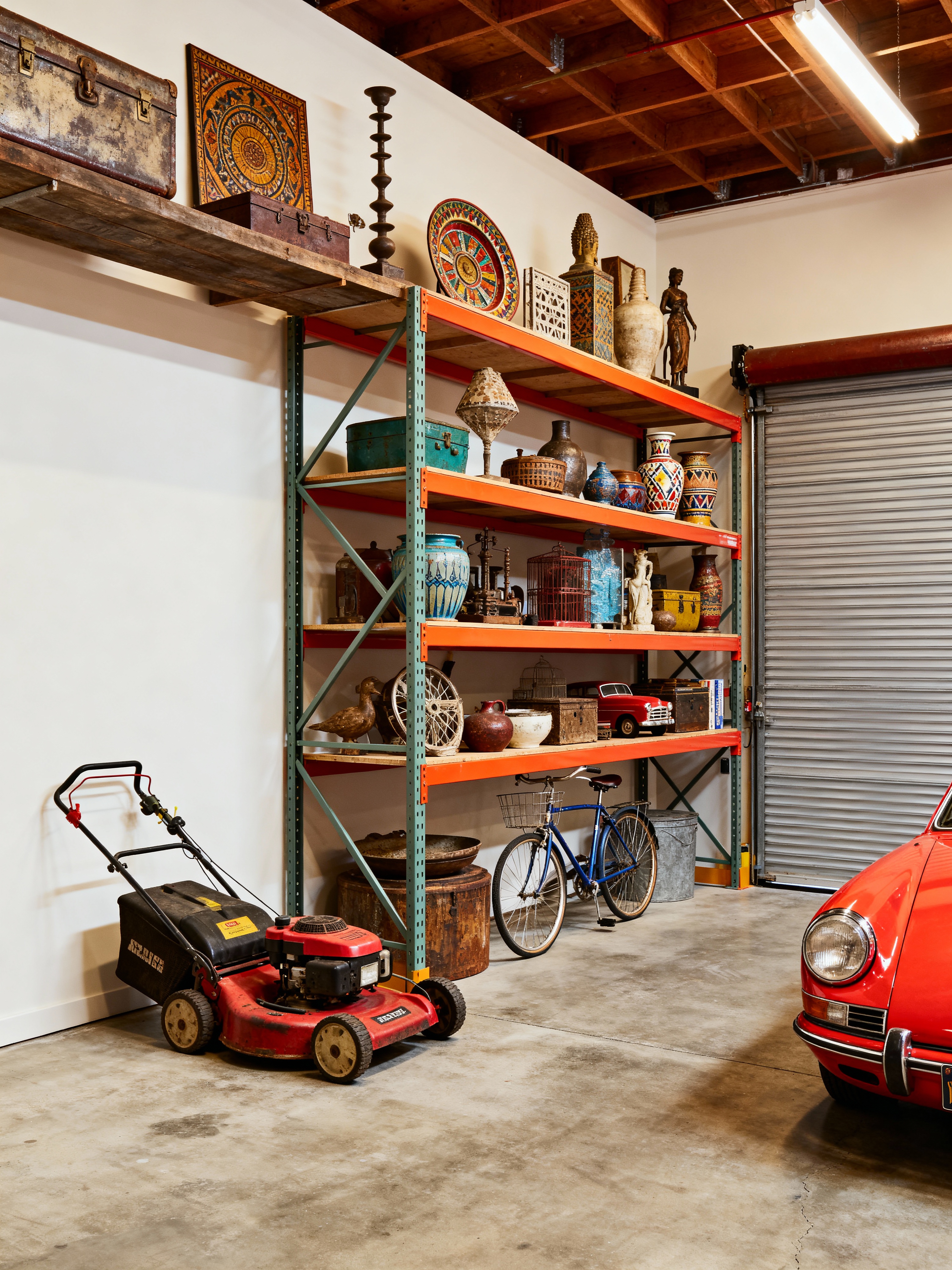 garage with eclectic style with concrete floor and storage racks and lawnmower and garage door and cars and bicycles and concrete floor. . with vintage finds and artistic flair and mixed styles and layered textures and bold combinations and global influences and personal expression and unique pieces