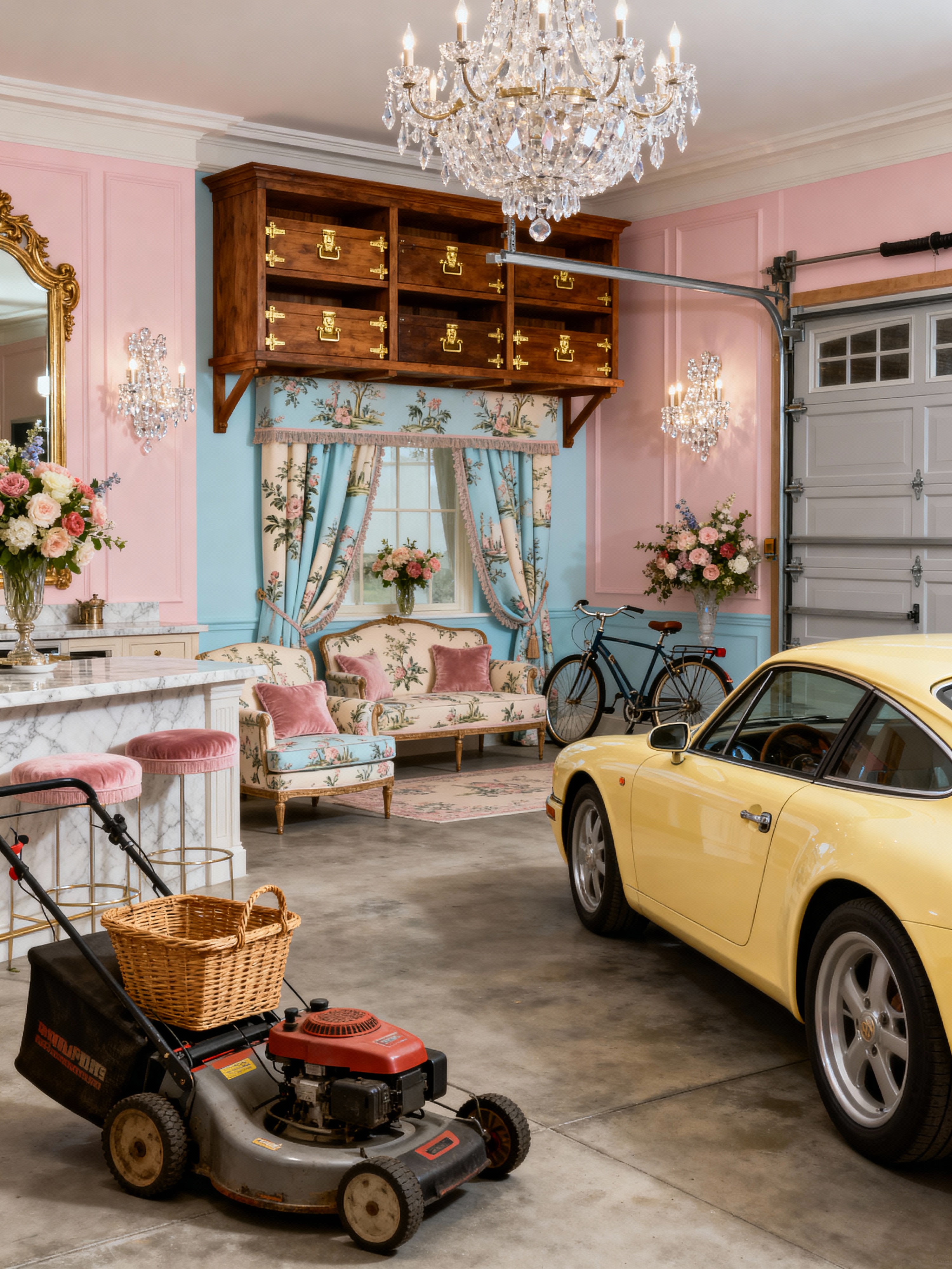 garage with french style with garage door and bicycles and lawnmower and concrete floor and cars and storage racks and garage door. . with sophisticated grace and provincial charm and soft pastels and toile patterns and crystal accents and romantic style and antique pieces and refined luxury