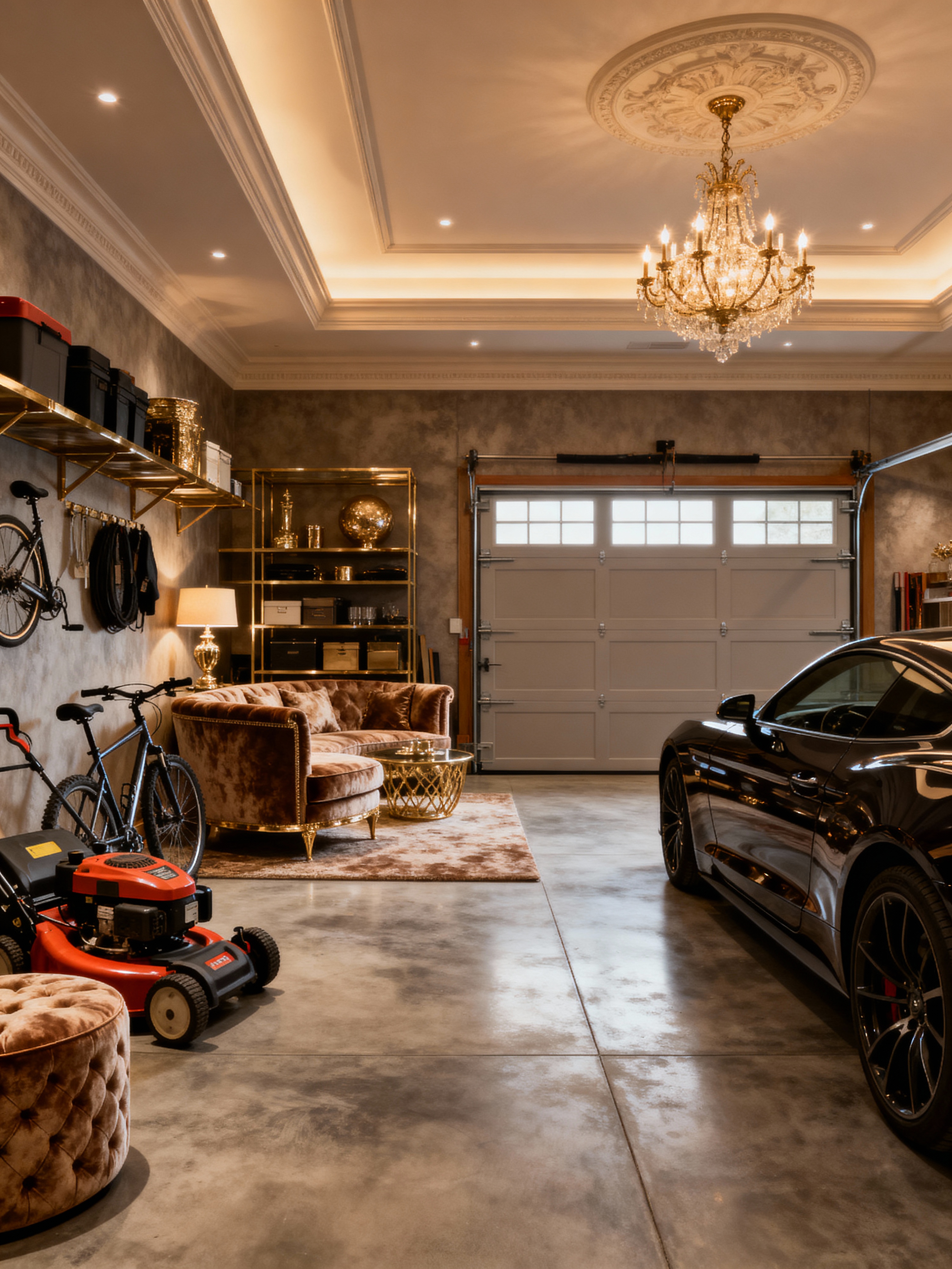 garage with luxury style with bicycles and lawnmower and cars and garage door and concrete floor and storage racks and bicycles. . with opulent details and elegant lighting and designer furniture and rich textures and premium finishes and lavish comfort and expensive fabrics and sophisticated style