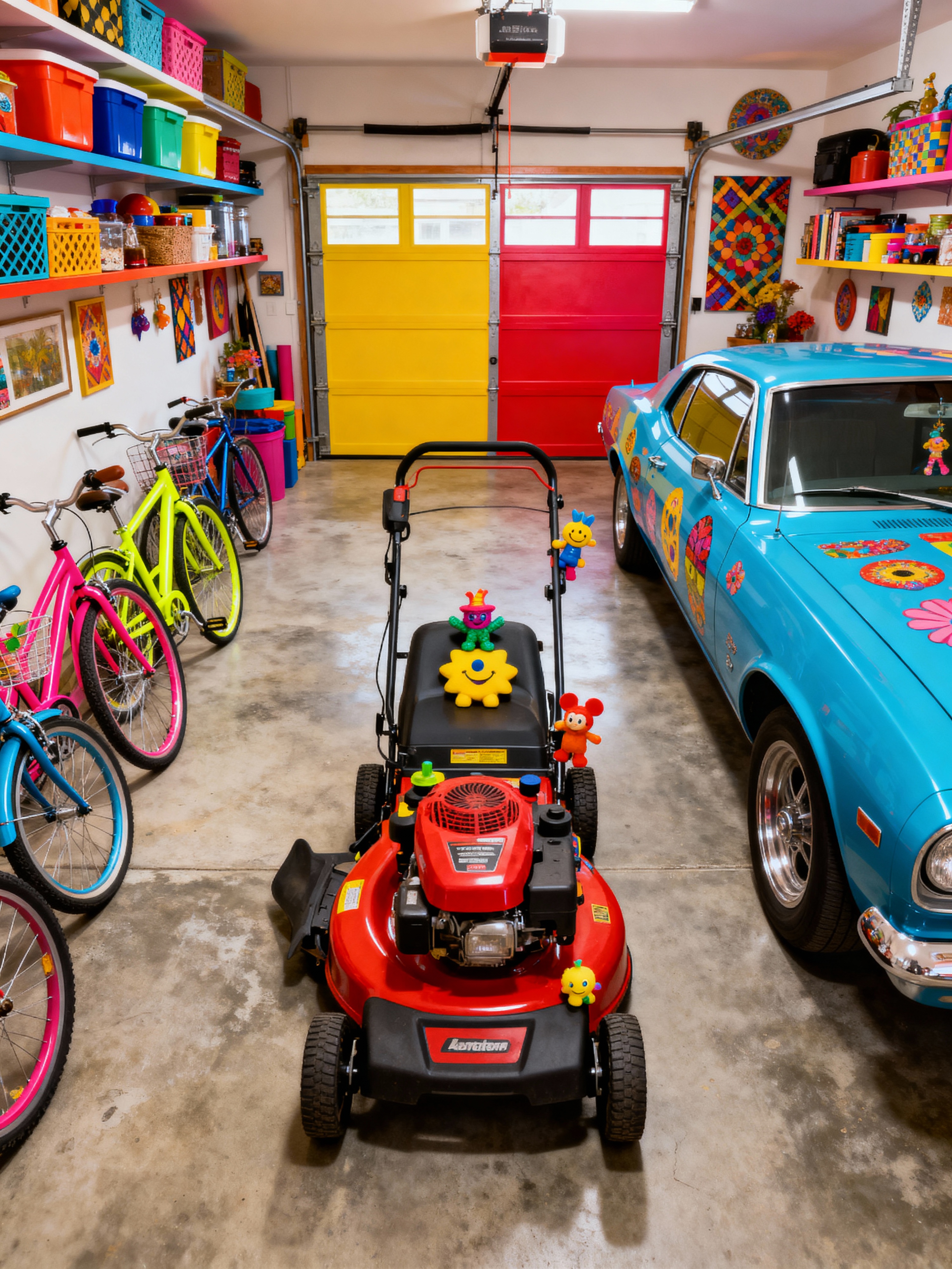 garage with maximalist style with concrete floor and lawnmower and garage door and cars and storage racks and bicycles and concrete floor. . with playful and bold creativity and eye-catching and vibrant and bold colors and over-the-top aesthetic and more is more philosophy and bold design