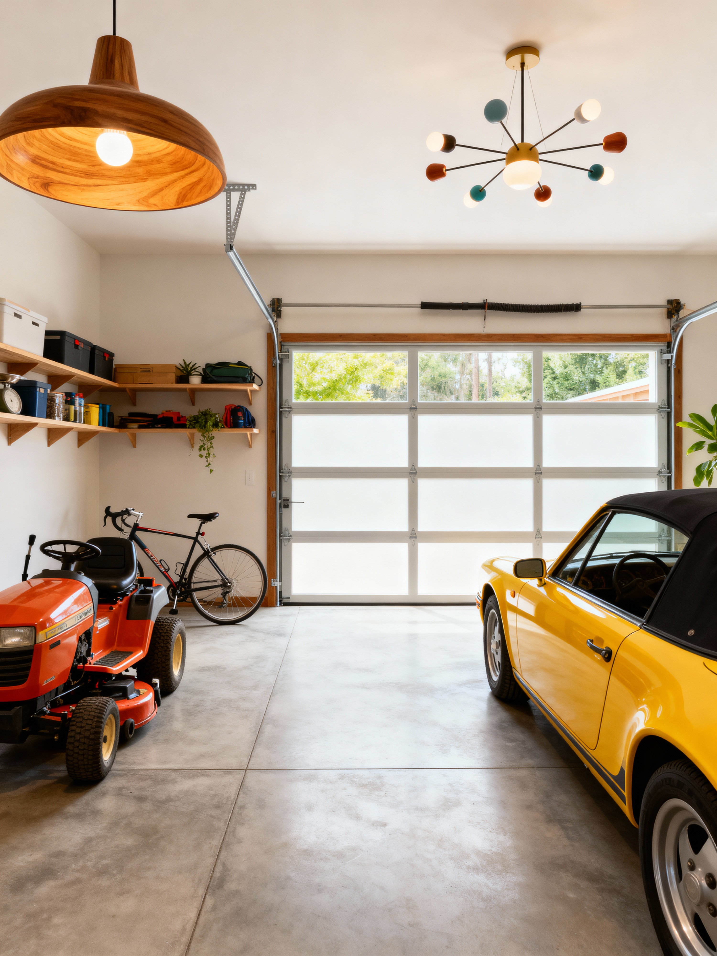 garage with midcentury modern style with lawnmower and cars and garage door and storage racks and concrete floor and bicycles and lawnmower. . with integrating indoor and outdoor motifs and minimalist and wood pendant light mid century modern chandelier and nature indoors and clean lines and mid century modern mobile chandelier and natural and manmade materials and vibrant colors