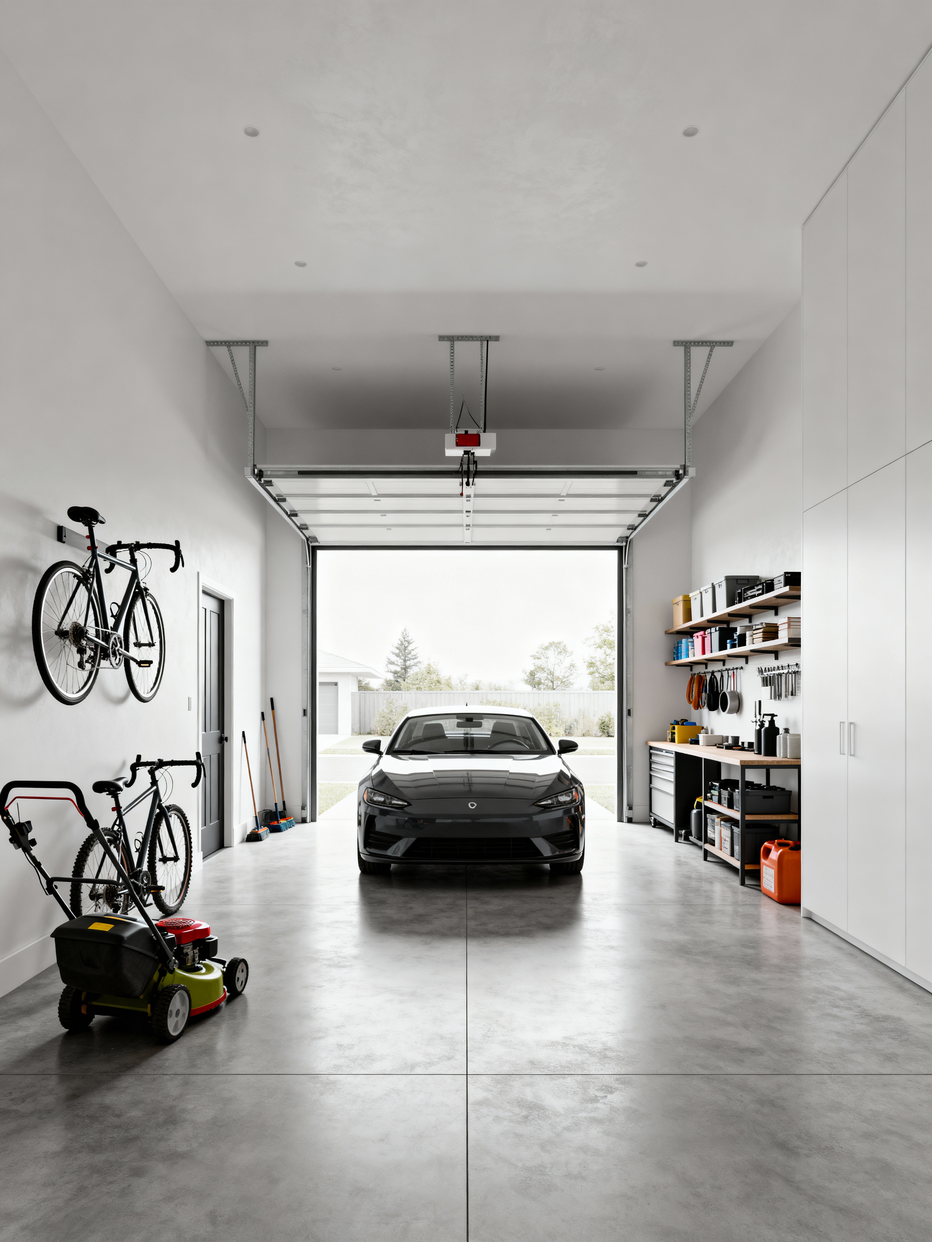 garage with minimalist style with concrete floor and bicycles and garage door and lawnmower and storage racks and cars and concrete floor. . with an open floor plan and lots of light and focus on the shape, colour and texture of just a few of essential elements and functional furniture and clean lines and a monochromatic palette with colour used as an accent and an open floor plan