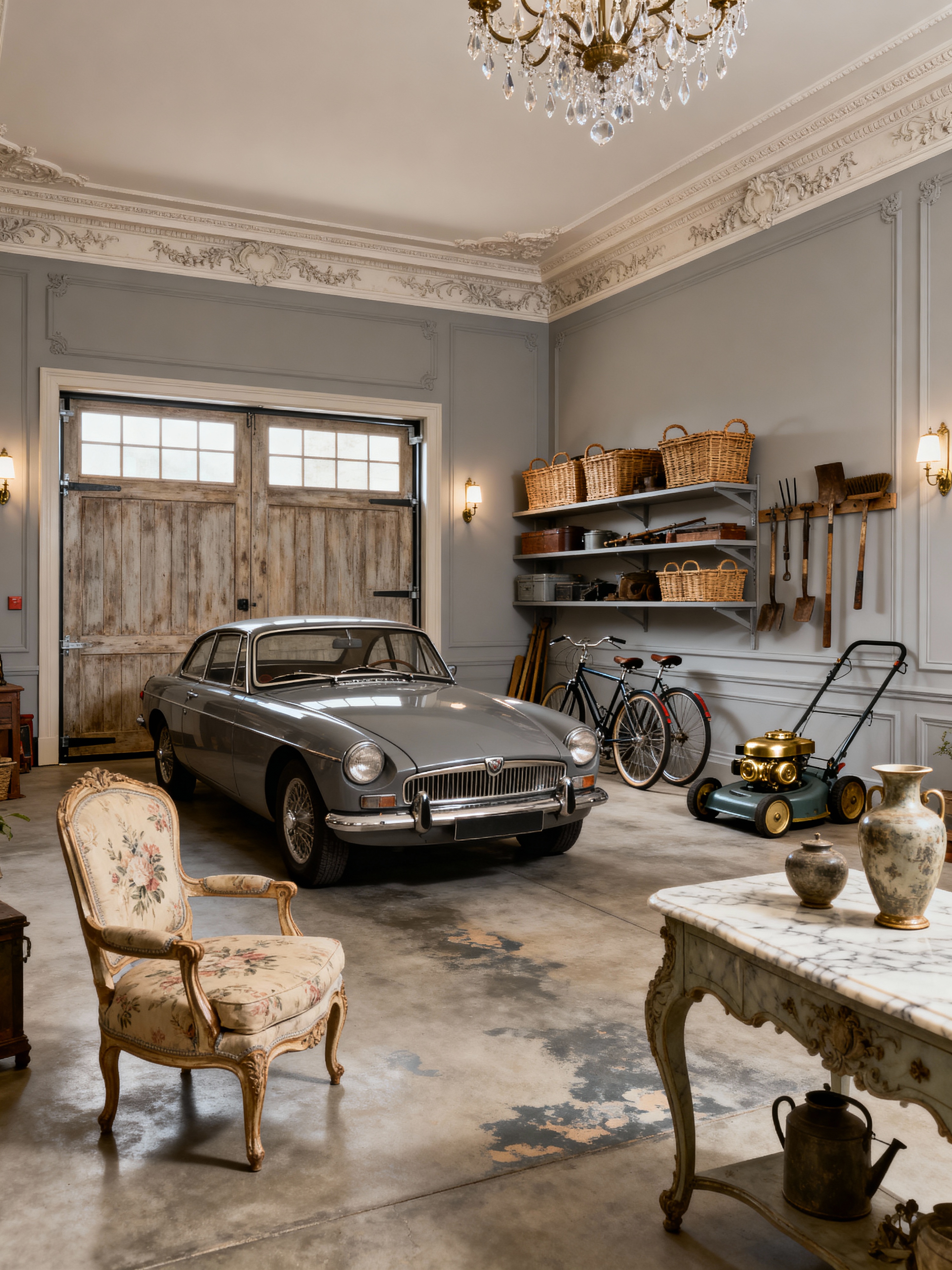garage with parisian style with garage door and bicycles and lawnmower and concrete floor and storage racks and cars and garage door. . with vintage pieces and refined style and neutral palette and ornate moldings and european flair and french elegance and classic details and antique furniture