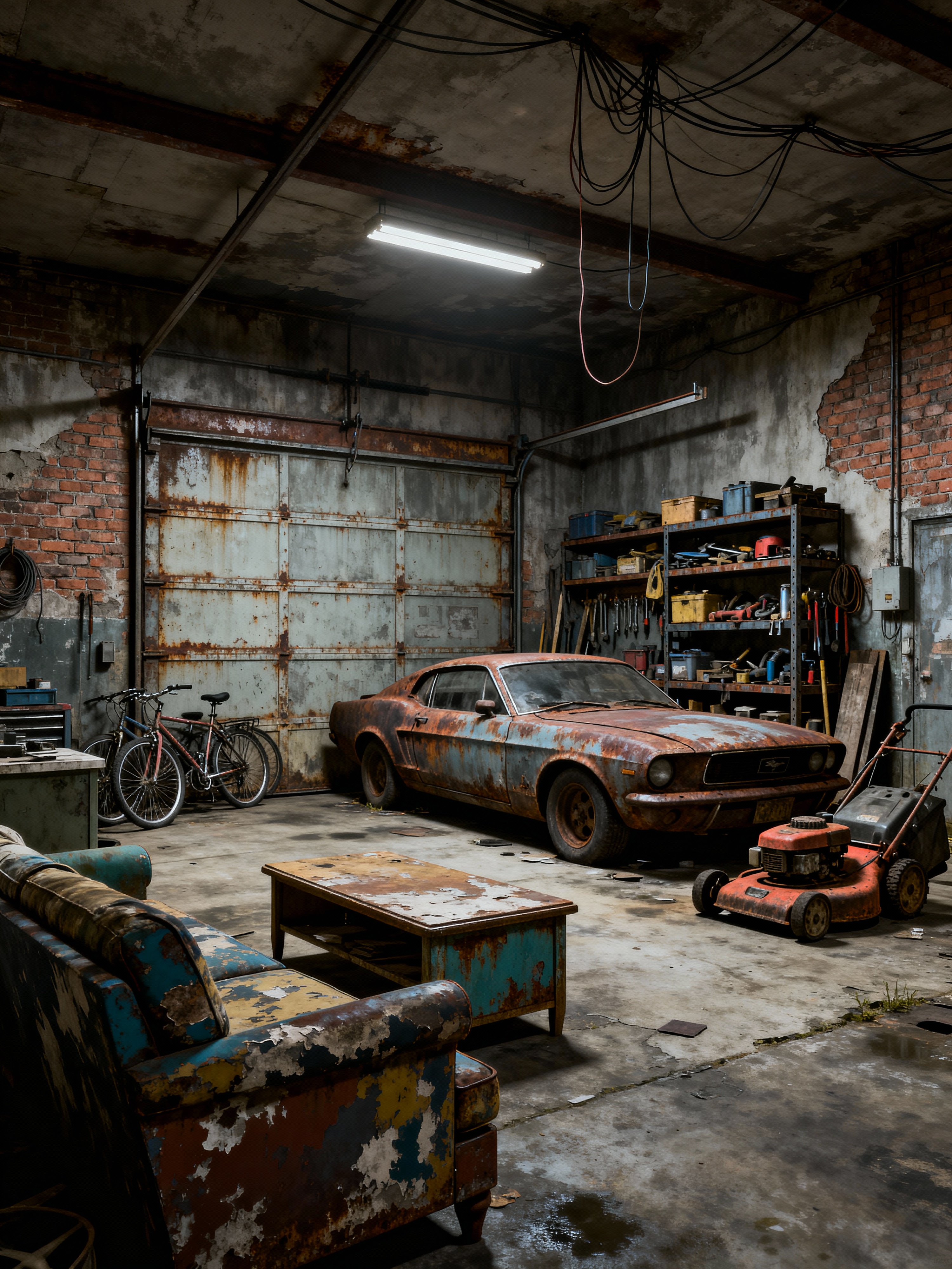 garage with post-apocalyptic style with cars and concrete floor and garage door and bicycles and storage racks and lawnmower and cars. . with dystopian style and cheap mismatched furniture and desolate and distressed furniture and makeshift furniture and rusted metal and hanging exposed wires and exposed bricks