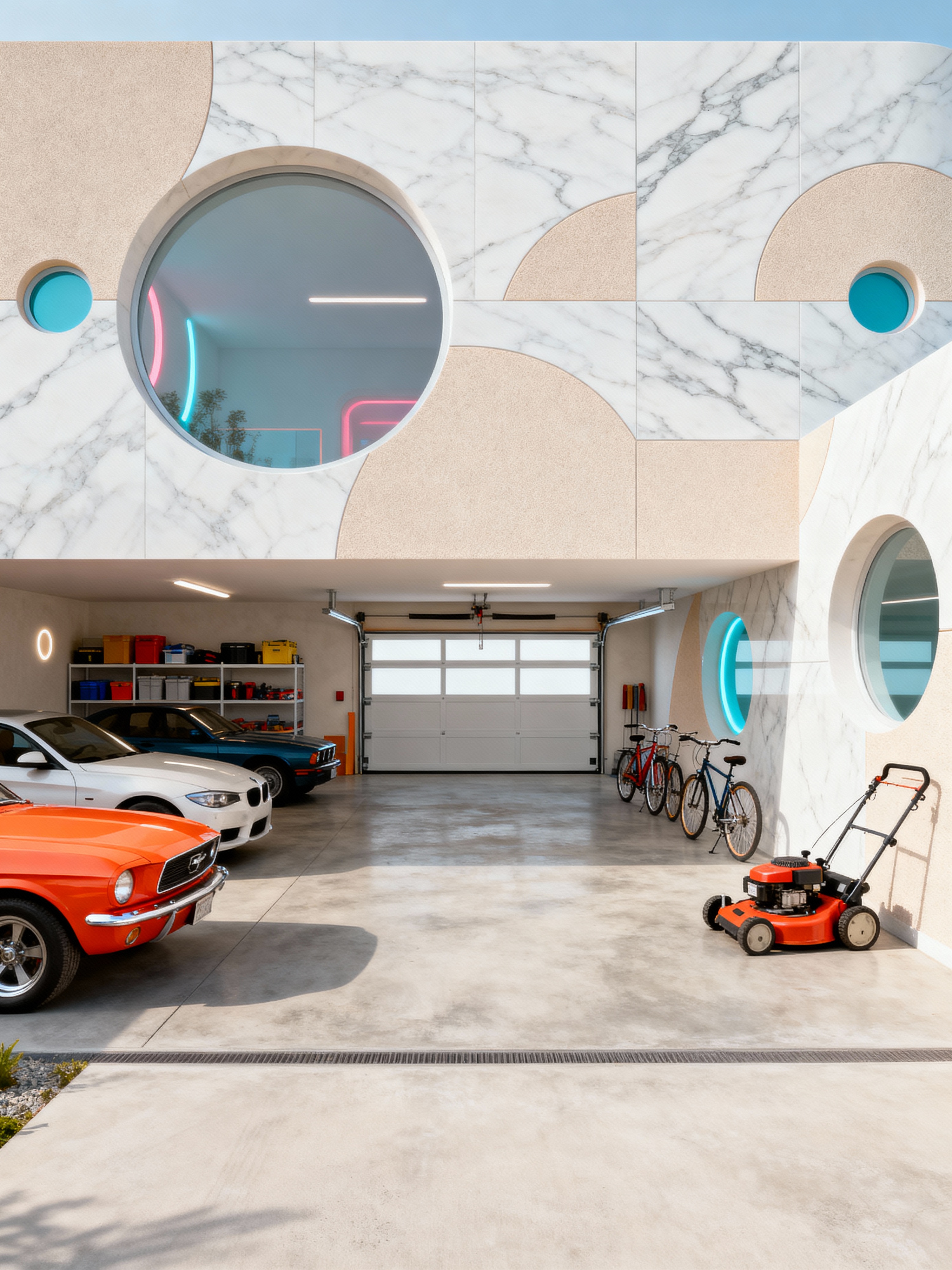 garage with retro futuristic style with cars and bicycles and storage racks and concrete floor and garage door and lawnmower and cars. . with futuristic interior and minimalist clean lines and neutral background and bright accents and futurism minimalist interior and circular shapes and smooth marble and light colors and strong geometric walls