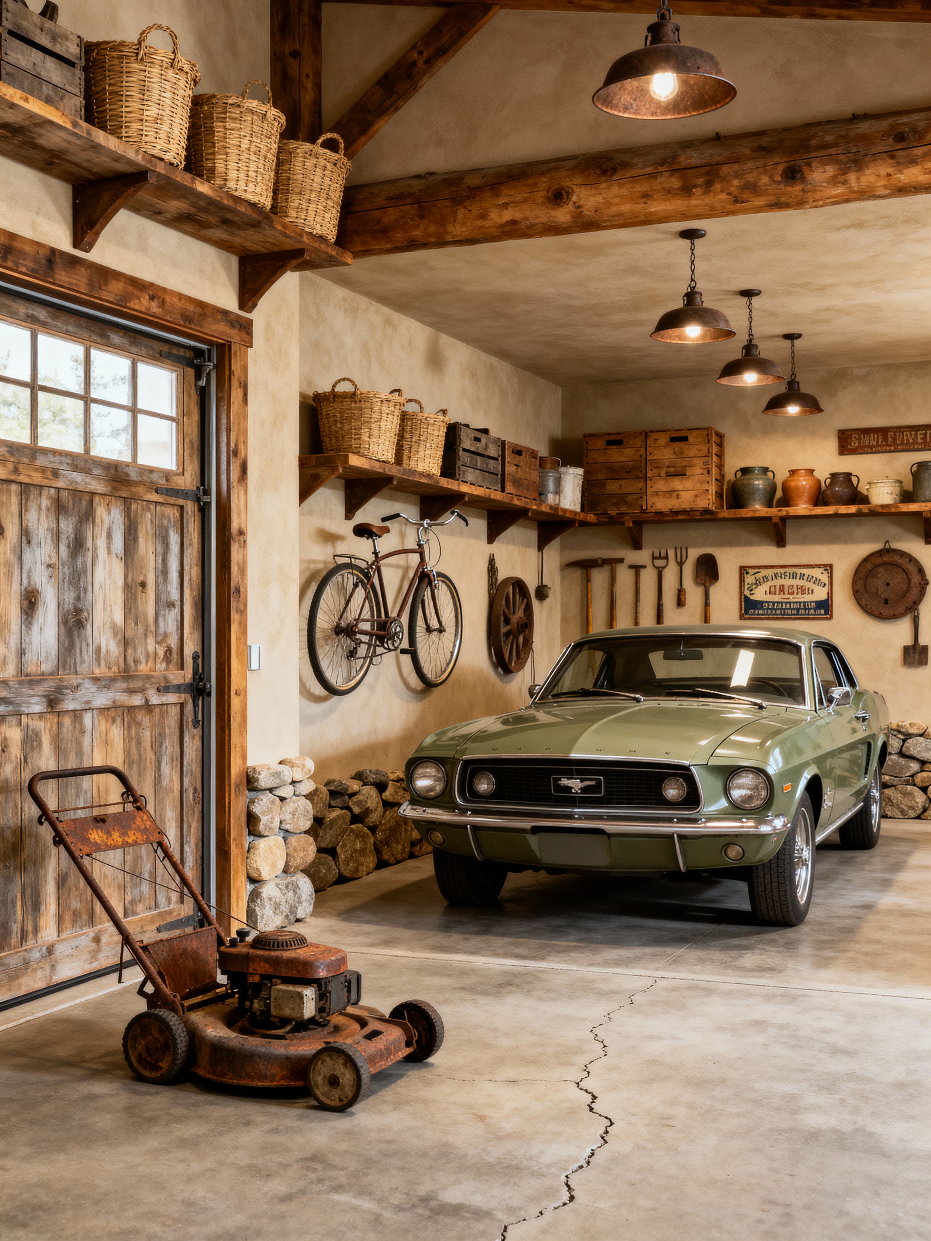 garage with rustic style with cars and lawnmower and concrete floor and garage door and storage racks and bicycles and cars. . with earthy tones and woven textures and iron fixtures and country style and natural wood and cozy cabin and vintage decor and stone accents