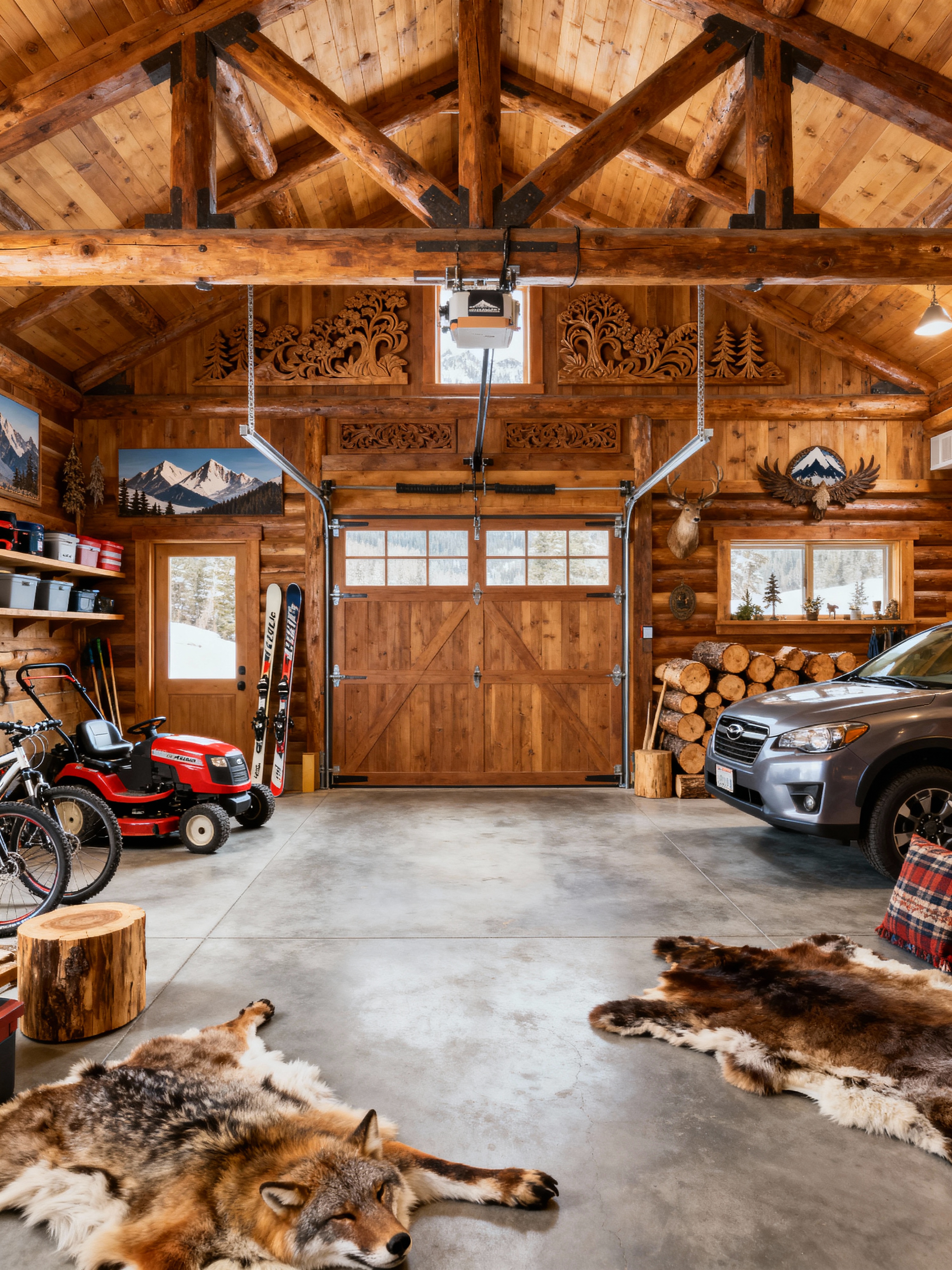 garage with ski chalet style with garage door and lawnmower and storage racks and cars and bicycles and concrete floor and garage door. . with exposed timber and mountain-inspired and wooden logs and nature-inspired and decorative carving and mouldings and animal rugs and layered textiles and ski-themed decor