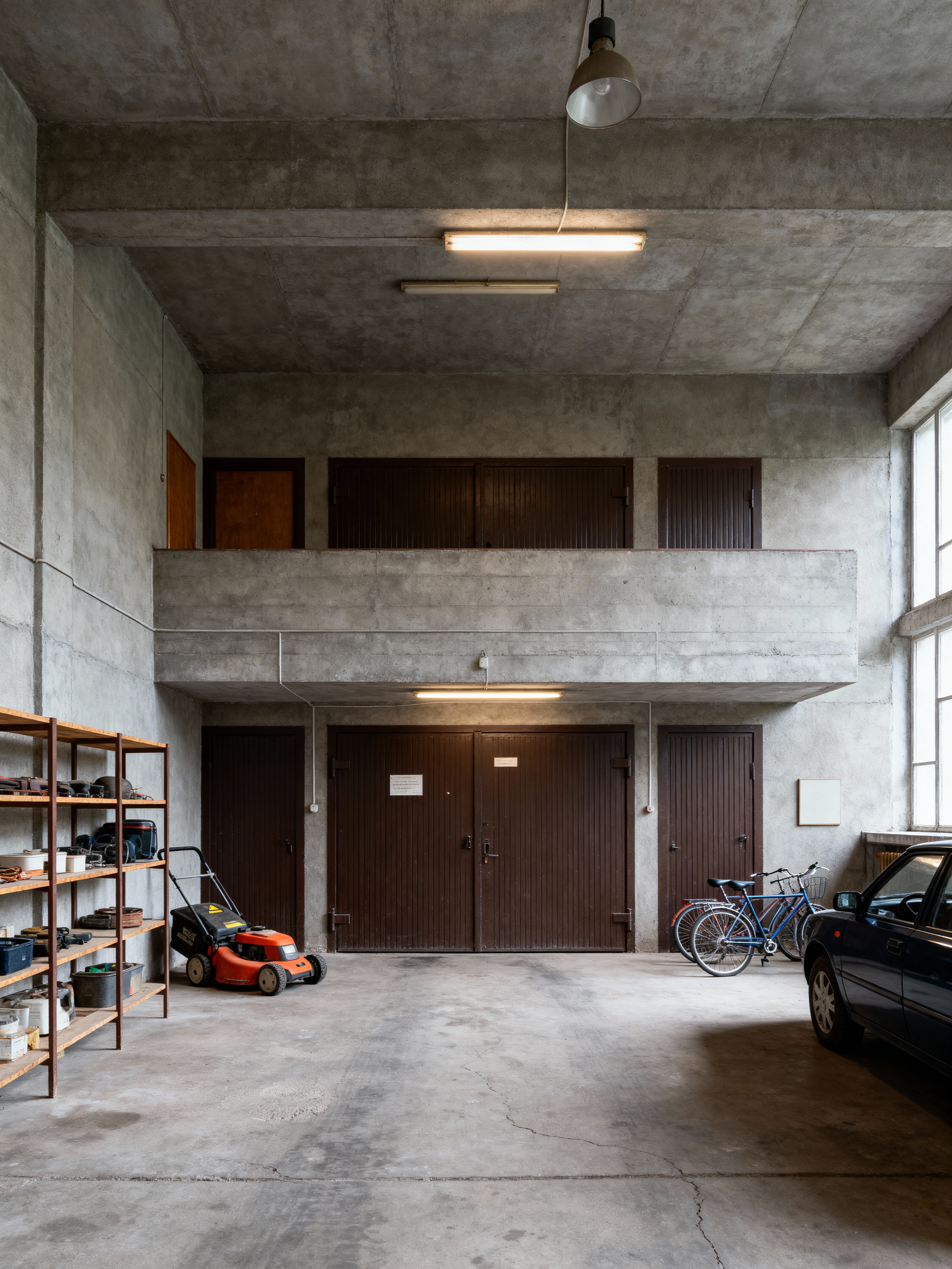 garage with soviet style with cars and concrete floor and bicycles and garage door and storage racks and lawnmower and cars. . with institutional look and austere aesthetic and utilitarian design and functional furniture and concrete structures and monumental scale and brutalist style and eastern bloc