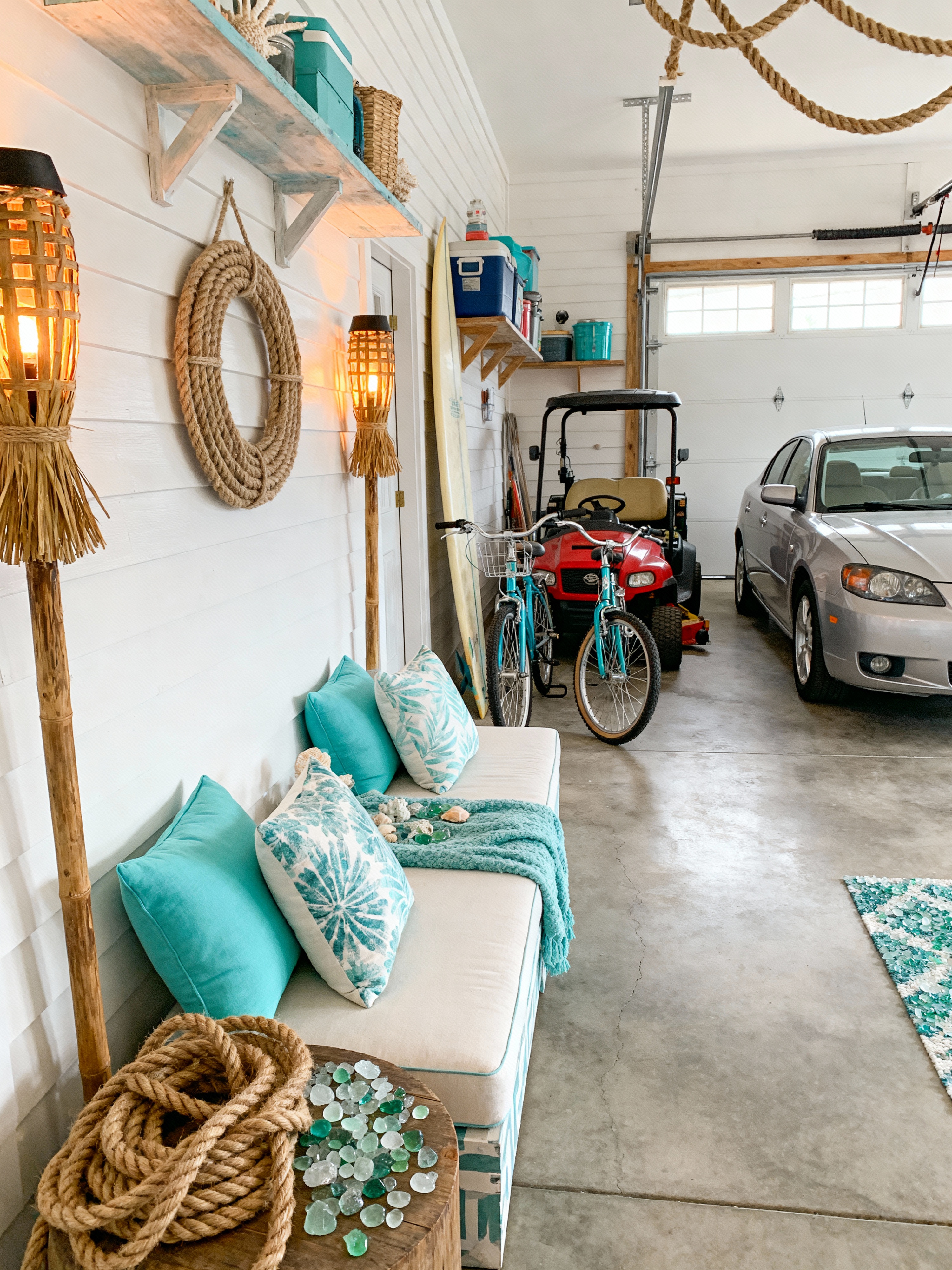garage with surf shack style with storage racks and garage door and bicycles and lawnmower and cars and concrete floor and storage racks. . with tiki torches and sea glass and rope details and beach vibes and white-washed walls and nautical rope and turquoise accents and beachy throw pillows