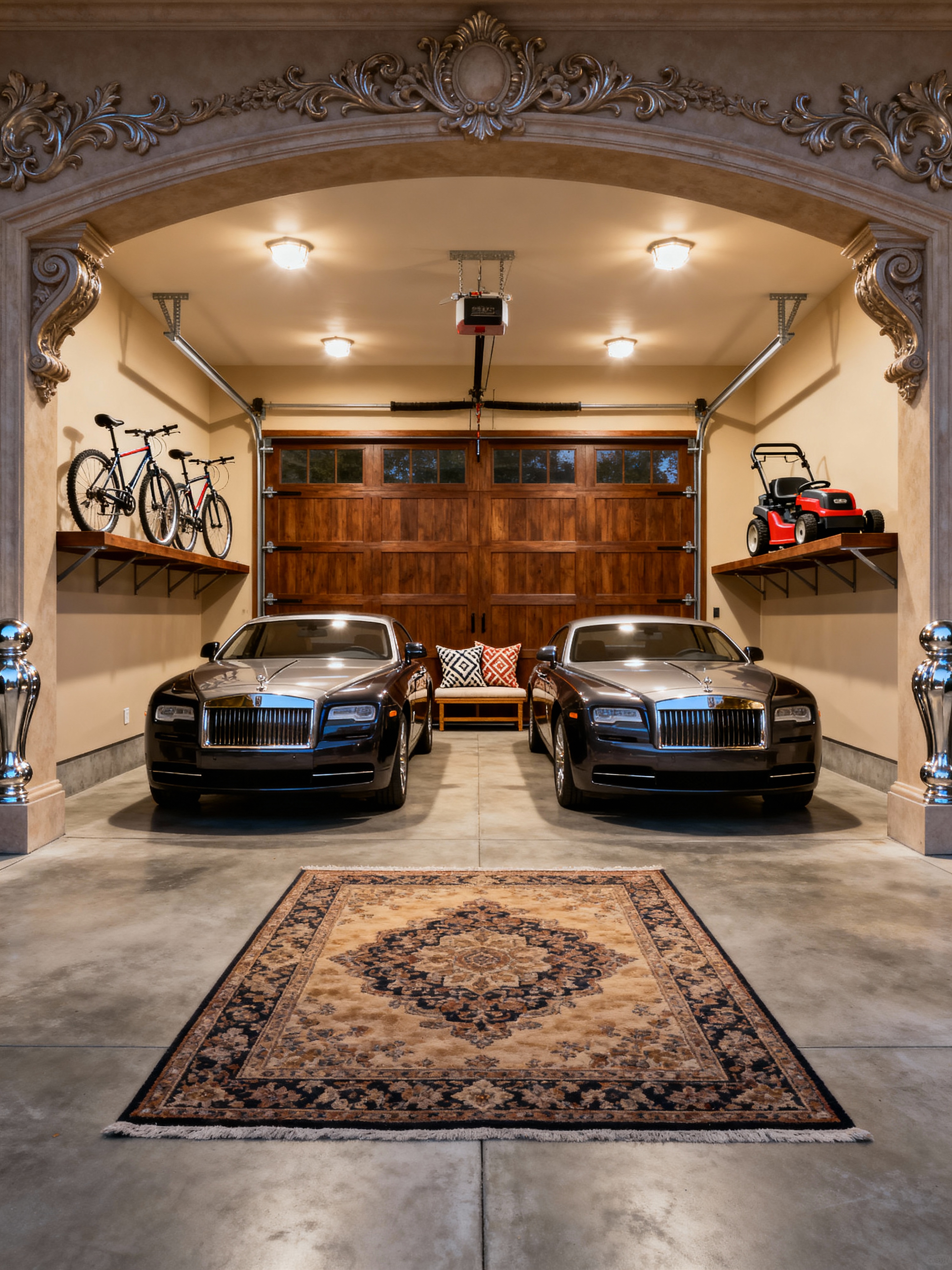 garage with traditional style with storage racks and bicycles and concrete floor and cars and garage door and lawnmower and storage racks. . with warm colors and luxurious textiles and ornate details and symmetrical layout and rich fabrics and timeless design and classic elegance and refined atmosphere
