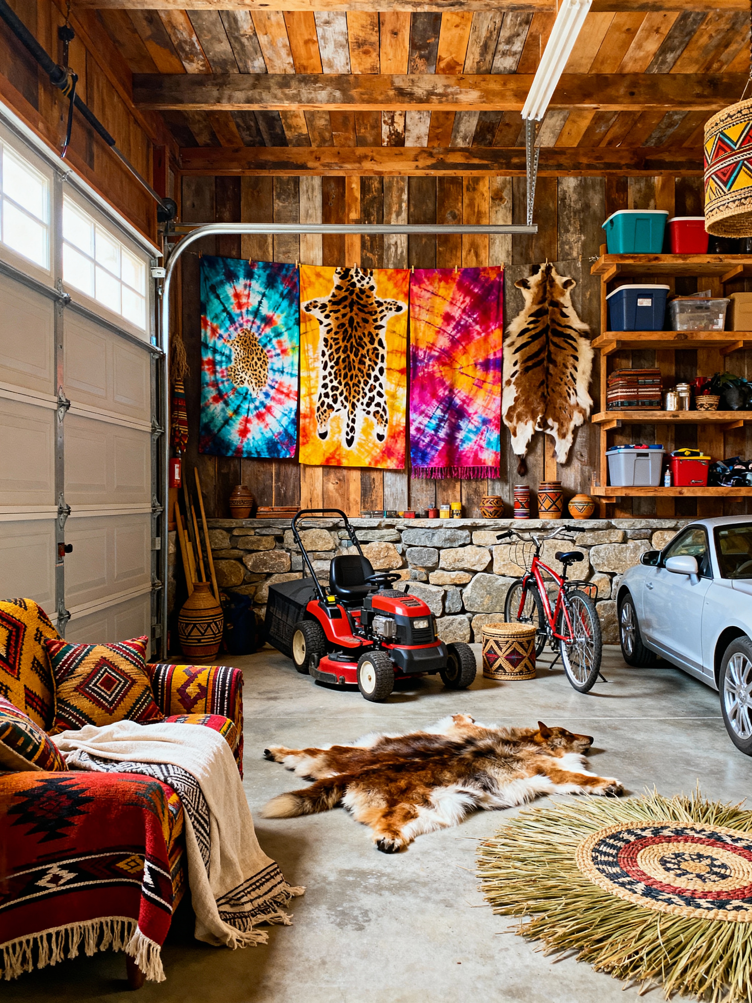 garage with tribal style with garage door and storage racks and lawnmower and bicycles and cars and concrete floor and garage door. . with animal furslinen and intricate grass weaving and exuberant splashes of colour and smooth worn timbers and planks of stone and hand dyed batik fabrics and animal prints and tribal revival