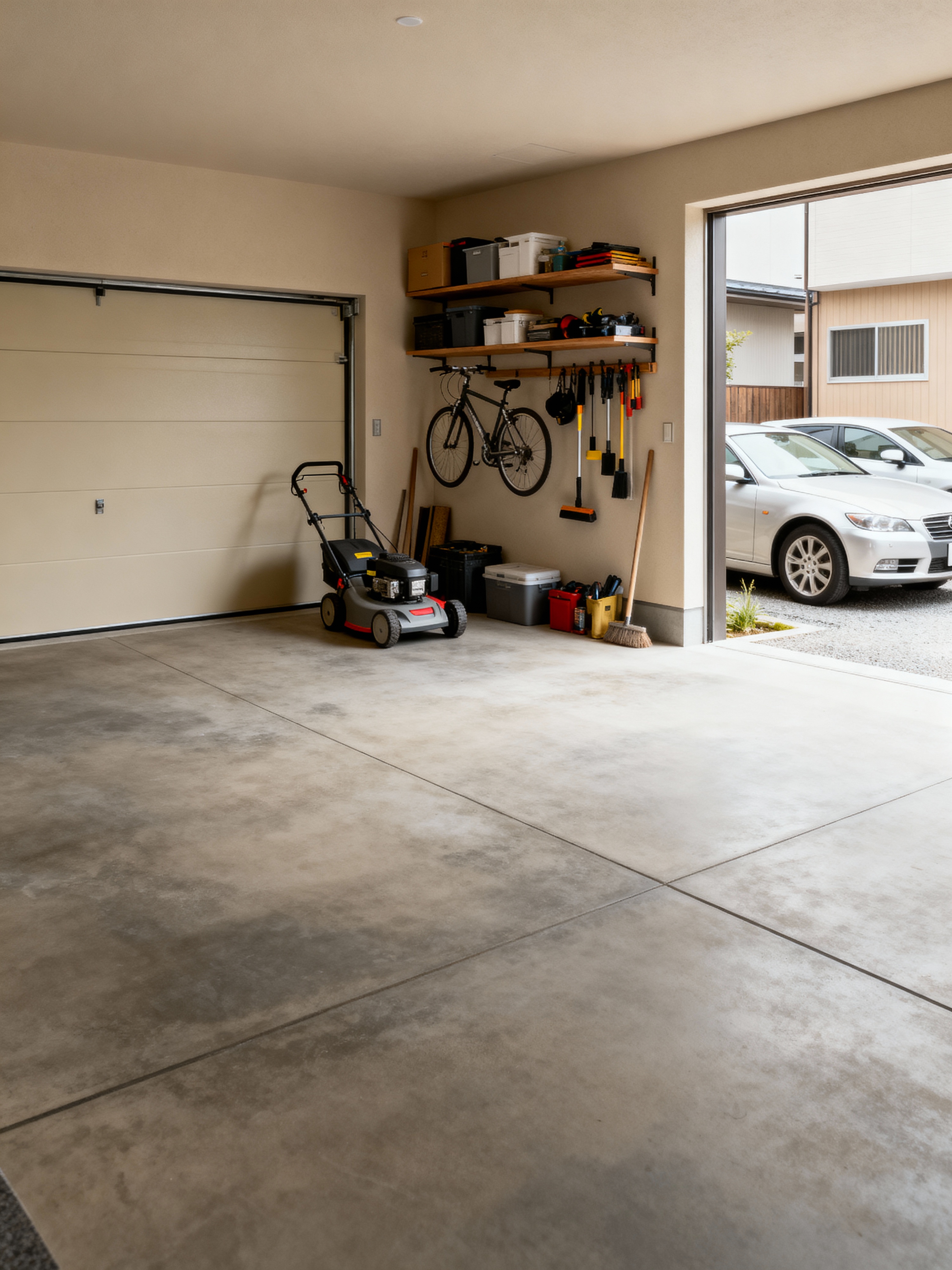 garage with zen style with lawnmower and storage racks and cars and concrete floor and garage door and bicycles and lawnmower. . with serenity and harmony and japanese minimalist interior and japanese minimalist interior and japanese interior and calm and neutral colors and simplicity and japanese minimalist interior and clutter free