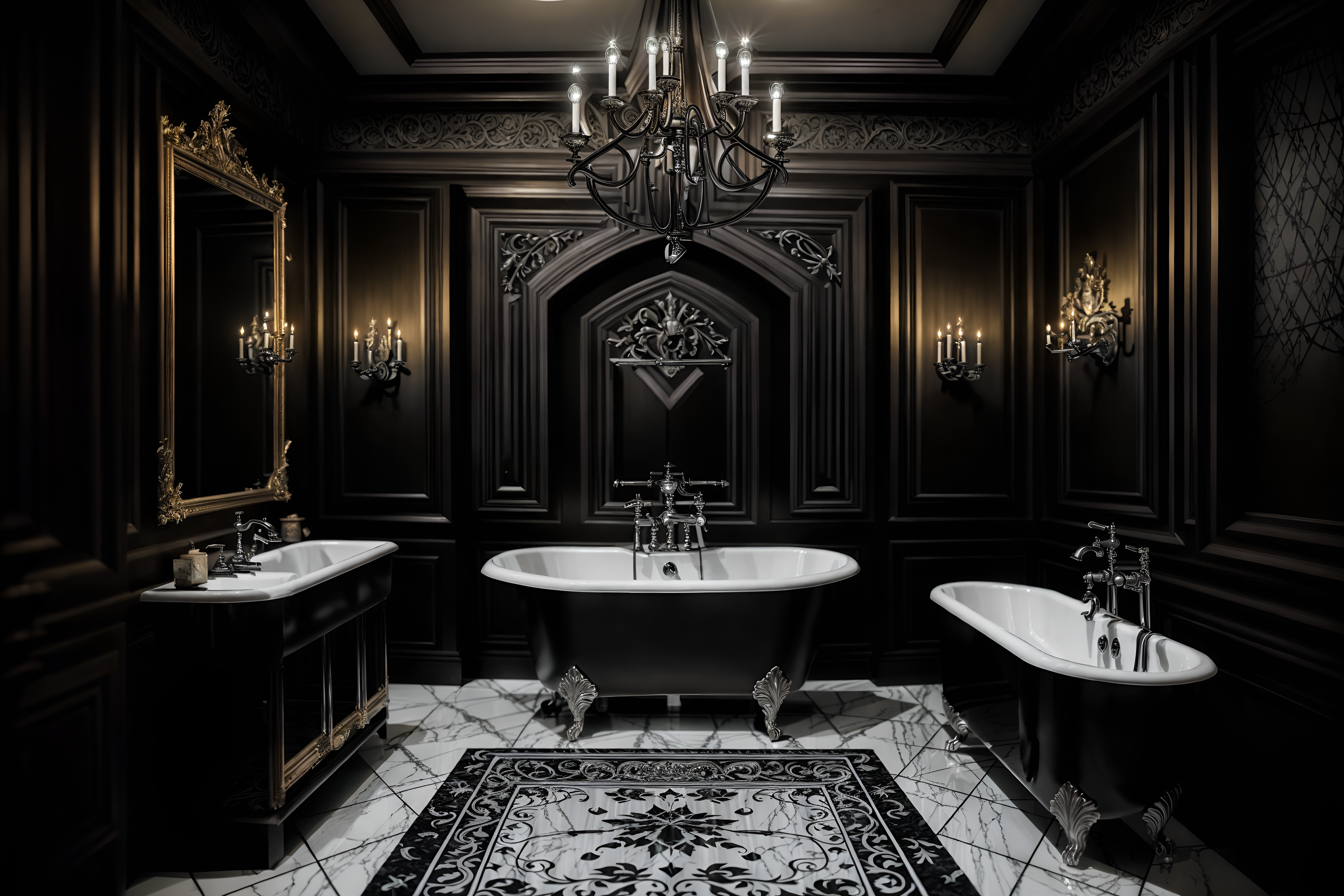 photo from pinterest of gothic-style interior designed (hotel bathroom interior) with bathtub and bath rail and mirror and waste basket and bathroom sink with faucet and bath towel and plant and shower cinematic photo, highly detailed, cinematic lighting, ultra-detailed, ultrarealistic, photorealism, 8k. trending on pinterest. gothic interior design style. masterpiece, cinematic light, ultrarealistic+, photorealistic+, 8k, raw photo, realistic, sharp focus on eyes, (symmetrical eyes), (intact eyes), hyperrealistic, highest quality, best quality, , highly detailed, masterpiece, best quality, extremely detailed 8k wallpaper, masterpiece, best quality, ultra-detailed, best shadow, detailed background, detailed face, detailed eyes, high contrast, best illumination, detailed face, dulux, caustic, dynamic angle, detailed glow. dramatic lighting. highly detailed, insanely detailed hair, symmetrical, intricate details, professionally retouched, 8k high definition. strong bokeh. award winning photo.