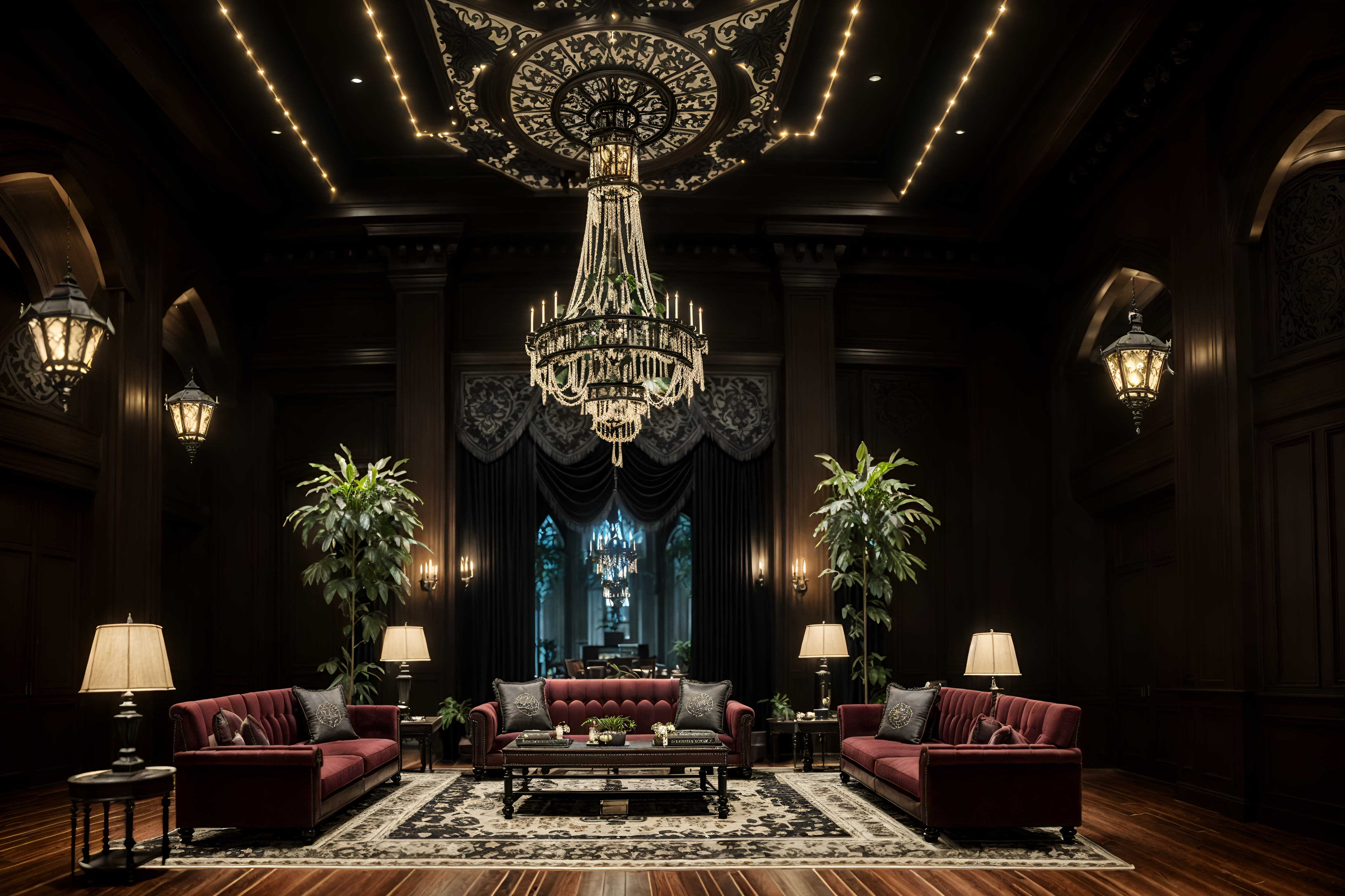 photo from pinterest of gothic-style interior designed (hotel lobby interior) with sofas and coffee tables and lounge chairs and hanging lamps and rug and check in desk and furniture and plant cinematic photo, highly detailed, cinematic lighting, ultra-detailed, ultrarealistic, photorealism, 8k. trending on pinterest. gothic interior design style. masterpiece, cinematic light, ultrarealistic+, photorealistic+, 8k, raw photo, realistic, sharp focus on eyes, (symmetrical eyes), (intact eyes), hyperrealistic, highest quality, best quality, , highly detailed, masterpiece, best quality, extremely detailed 8k wallpaper, masterpiece, best quality, ultra-detailed, best shadow, detailed background, detailed face, detailed eyes, high contrast, best illumination, detailed face, dulux, caustic, dynamic angle, detailed glow. dramatic lighting. highly detailed, insanely detailed hair, symmetrical, intricate details, professionally retouched, 8k high definition. strong bokeh. award winning photo.