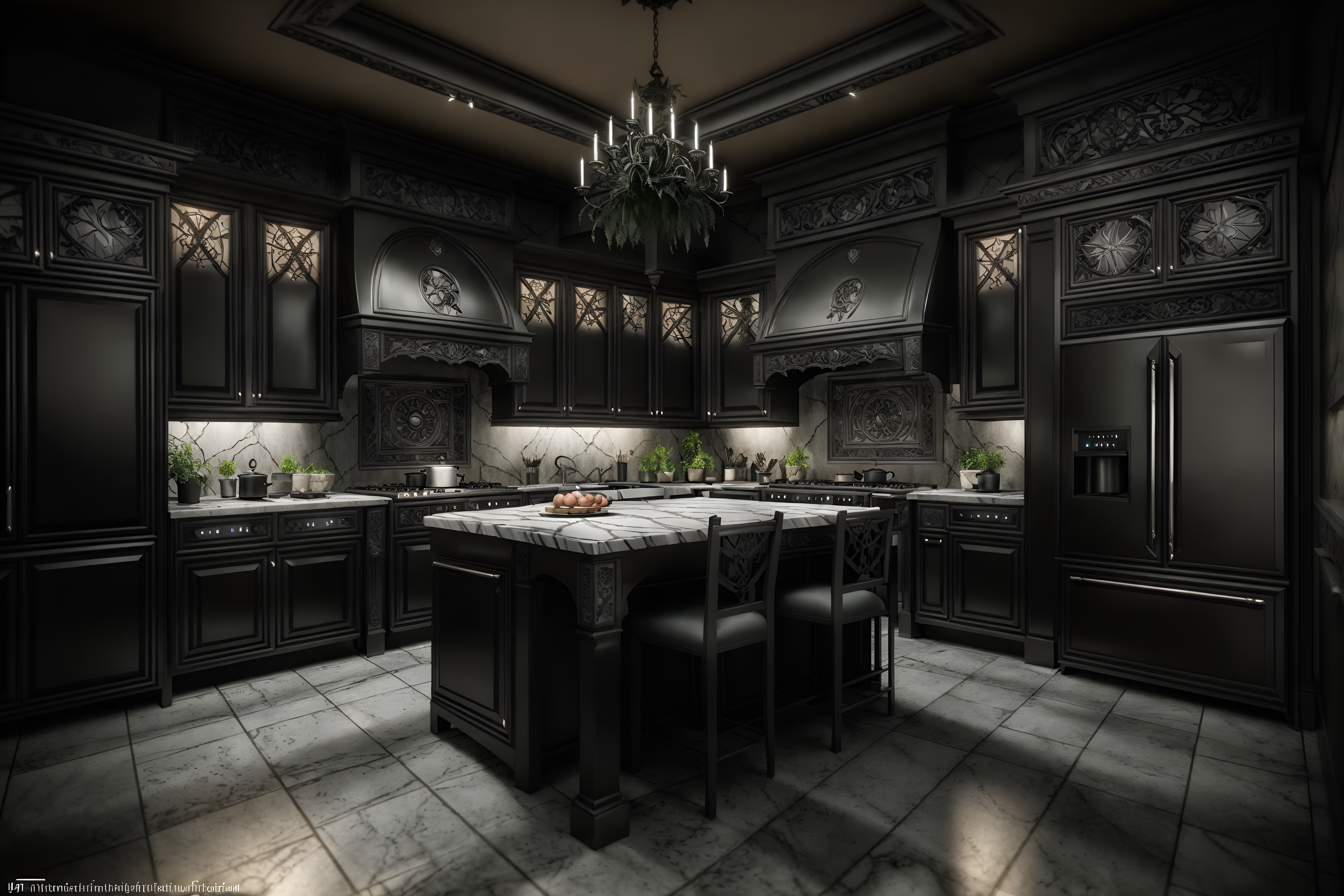 photo from pinterest of gothic-style interior designed (kitchen interior) with plant and refrigerator and sink and worktops and stove and kitchen cabinets and plant cinematic photo, highly detailed, cinematic lighting, ultra-detailed, ultrarealistic, photorealism, 8k. trending on pinterest. gothic interior design style. masterpiece, cinematic light, ultrarealistic+, photorealistic+, 8k, raw photo, realistic, sharp focus on eyes, (symmetrical eyes), (intact eyes), hyperrealistic, highest quality, best quality, , highly detailed, masterpiece, best quality, extremely detailed 8k wallpaper, masterpiece, best quality, ultra-detailed, best shadow, detailed background, detailed face, detailed eyes, high contrast, best illumination, detailed face, dulux, caustic, dynamic angle, detailed glow. dramatic lighting. highly detailed, insanely detailed hair, symmetrical, intricate details, professionally retouched, 8k high definition. strong bokeh. award winning photo.