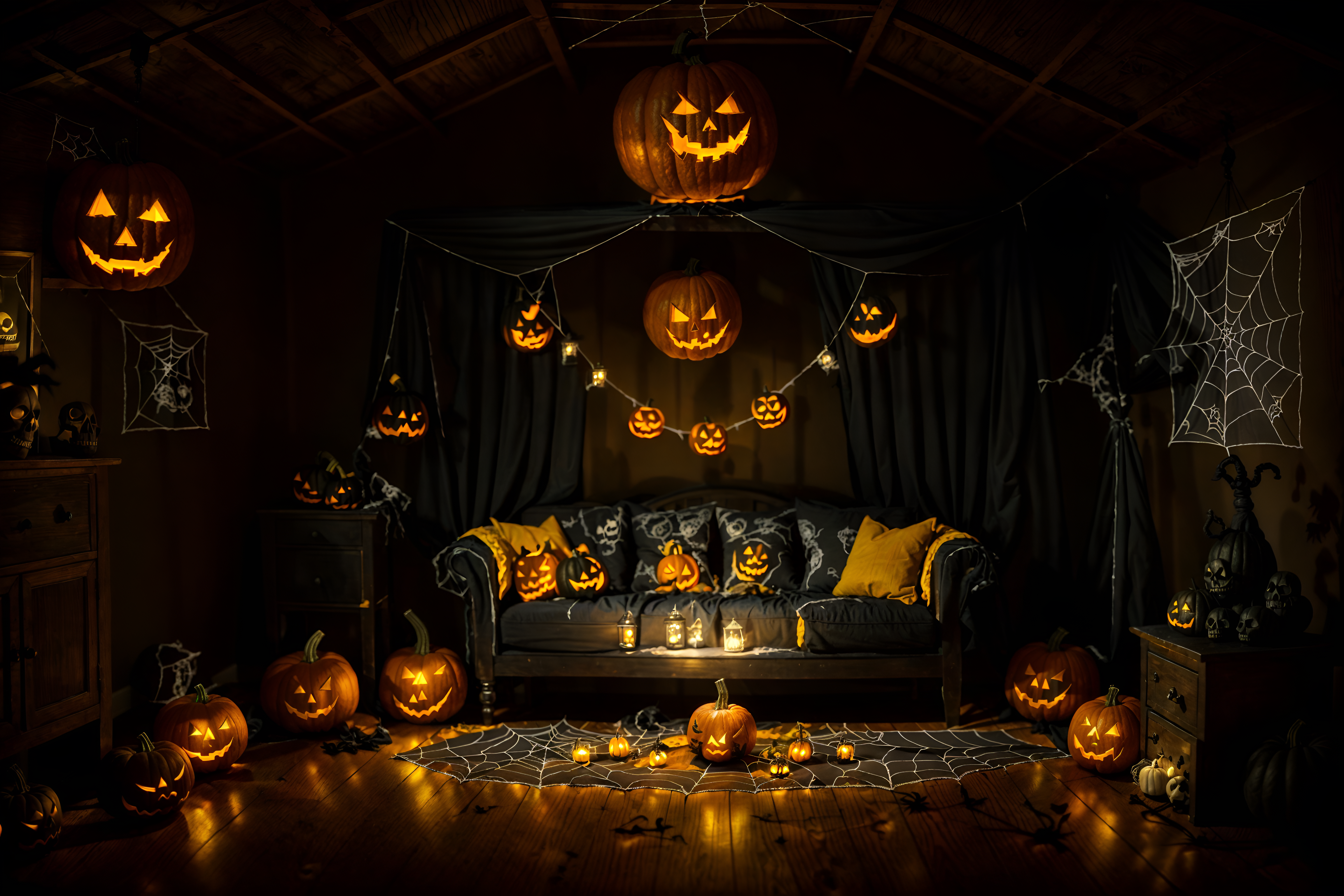 photo from pinterest of halloween-style interior designed (attic interior) . with glowing pumpkins and human skulls and yellow black balloons and cobwebs and lanterns and lanterns and spiderwebs and skeletons sitting and standing. . cinematic photo, highly detailed, cinematic lighting, ultra-detailed, ultrarealistic, photorealism, 8k. trending on pinterest. halloween interior design style. masterpiece, cinematic light, ultrarealistic+, photorealistic+, 8k, raw photo, realistic, sharp focus on eyes, (symmetrical eyes), (intact eyes), hyperrealistic, highest quality, best quality, , highly detailed, masterpiece, best quality, extremely detailed 8k wallpaper, masterpiece, best quality, ultra-detailed, best shadow, detailed background, detailed face, detailed eyes, high contrast, best illumination, detailed face, dulux, caustic, dynamic angle, detailed glow. dramatic lighting. highly detailed, insanely detailed hair, symmetrical, intricate details, professionally retouched, 8k high definition. strong bokeh. award winning photo.