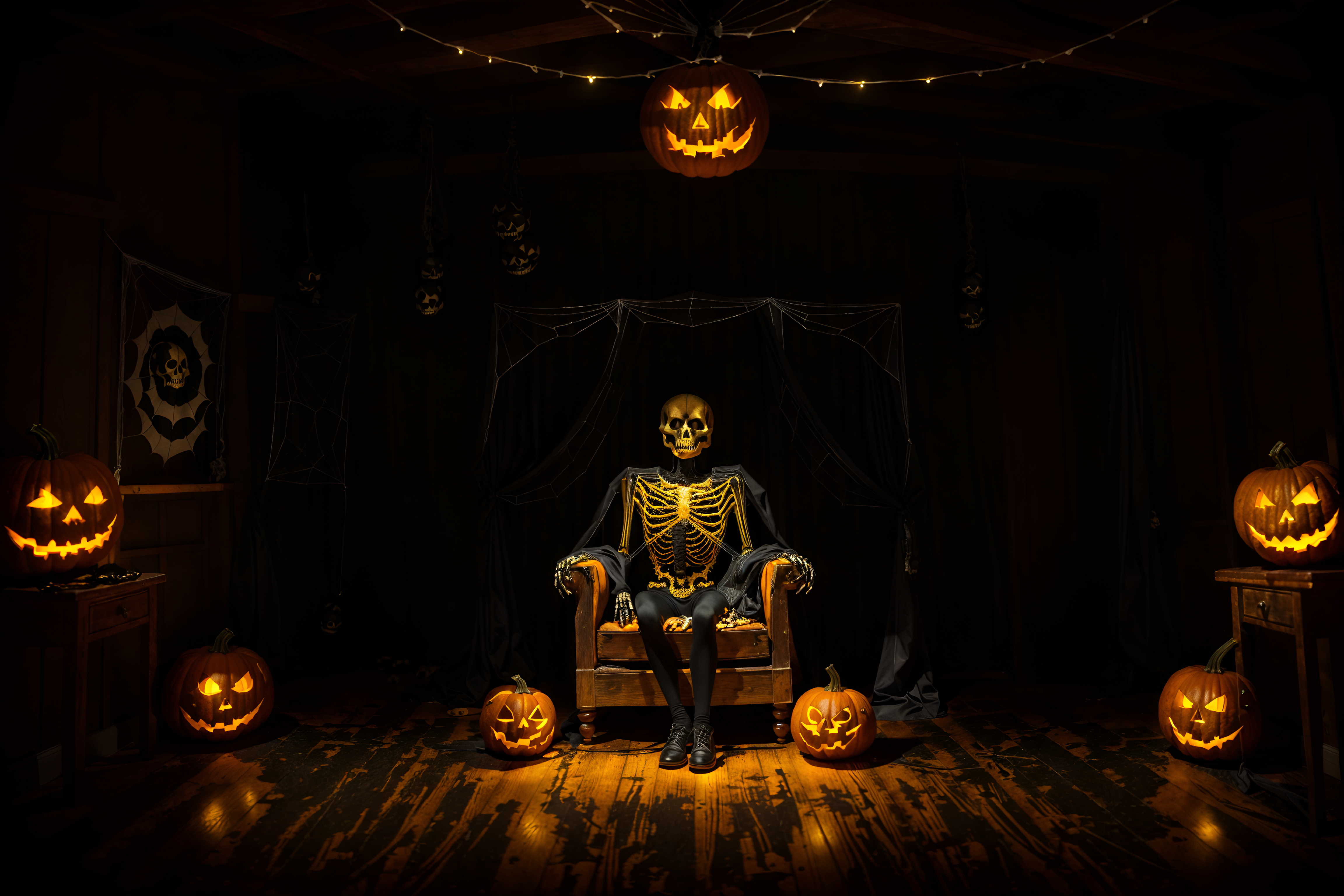 photo from pinterest of halloween-style interior designed (attic interior) . with glowing pumpkins and human skulls and yellow black balloons and cobwebs and lanterns and lanterns and spiderwebs and skeletons sitting and standing. . cinematic photo, highly detailed, cinematic lighting, ultra-detailed, ultrarealistic, photorealism, 8k. trending on pinterest. halloween interior design style. masterpiece, cinematic light, ultrarealistic+, photorealistic+, 8k, raw photo, realistic, sharp focus on eyes, (symmetrical eyes), (intact eyes), hyperrealistic, highest quality, best quality, , highly detailed, masterpiece, best quality, extremely detailed 8k wallpaper, masterpiece, best quality, ultra-detailed, best shadow, detailed background, detailed face, detailed eyes, high contrast, best illumination, detailed face, dulux, caustic, dynamic angle, detailed glow. dramatic lighting. highly detailed, insanely detailed hair, symmetrical, intricate details, professionally retouched, 8k high definition. strong bokeh. award winning photo.
