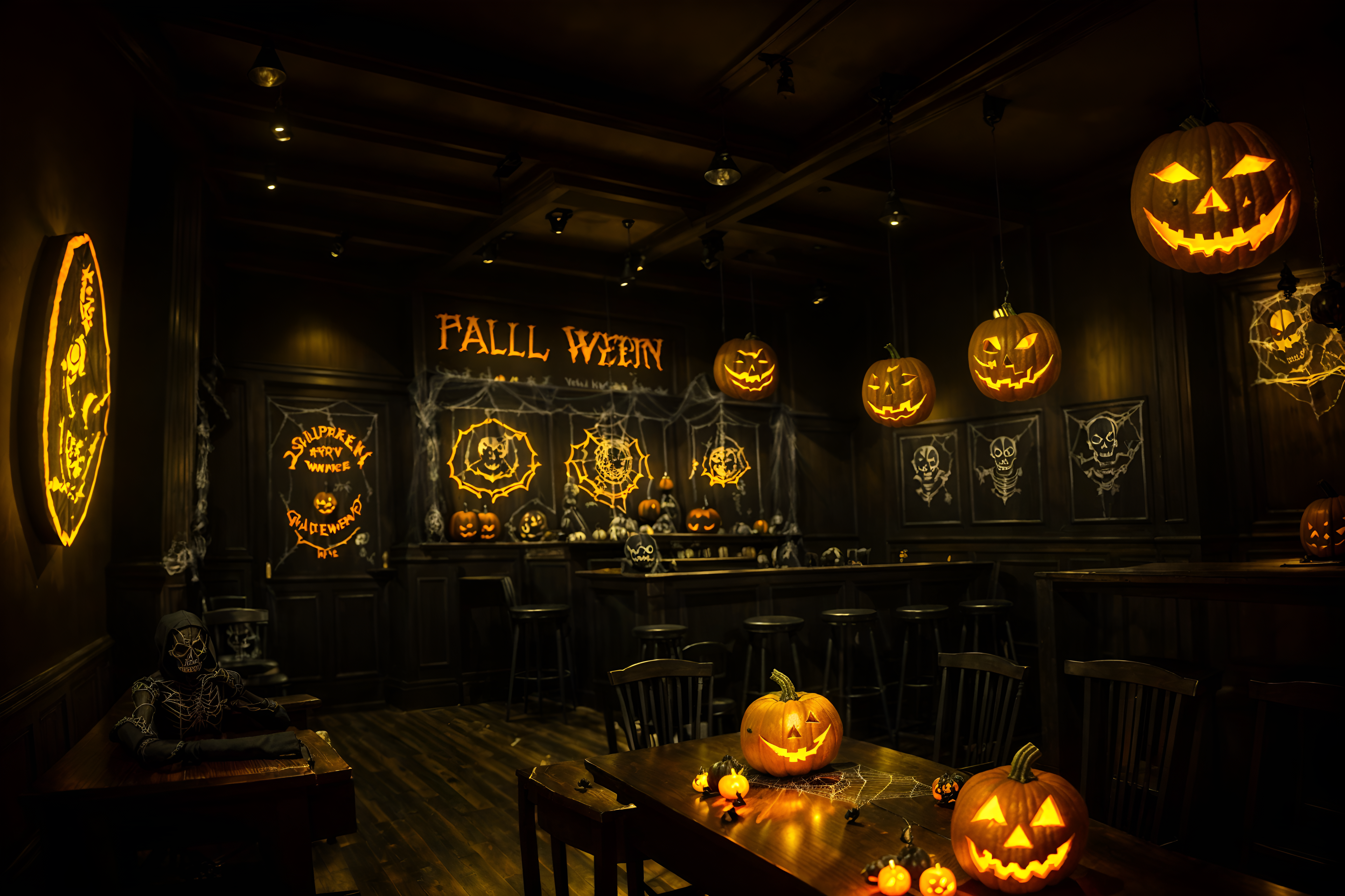 photo from pinterest of halloween-style interior designed (coffee shop interior) . with glowing pumpkins and spiderwebs and human skulls and lanterns and skeletons sitting and standing and yellow black balloons and cobwebs and cobwebs. . cinematic photo, highly detailed, cinematic lighting, ultra-detailed, ultrarealistic, photorealism, 8k. trending on pinterest. halloween interior design style. masterpiece, cinematic light, ultrarealistic+, photorealistic+, 8k, raw photo, realistic, sharp focus on eyes, (symmetrical eyes), (intact eyes), hyperrealistic, highest quality, best quality, , highly detailed, masterpiece, best quality, extremely detailed 8k wallpaper, masterpiece, best quality, ultra-detailed, best shadow, detailed background, detailed face, detailed eyes, high contrast, best illumination, detailed face, dulux, caustic, dynamic angle, detailed glow. dramatic lighting. highly detailed, insanely detailed hair, symmetrical, intricate details, professionally retouched, 8k high definition. strong bokeh. award winning photo.