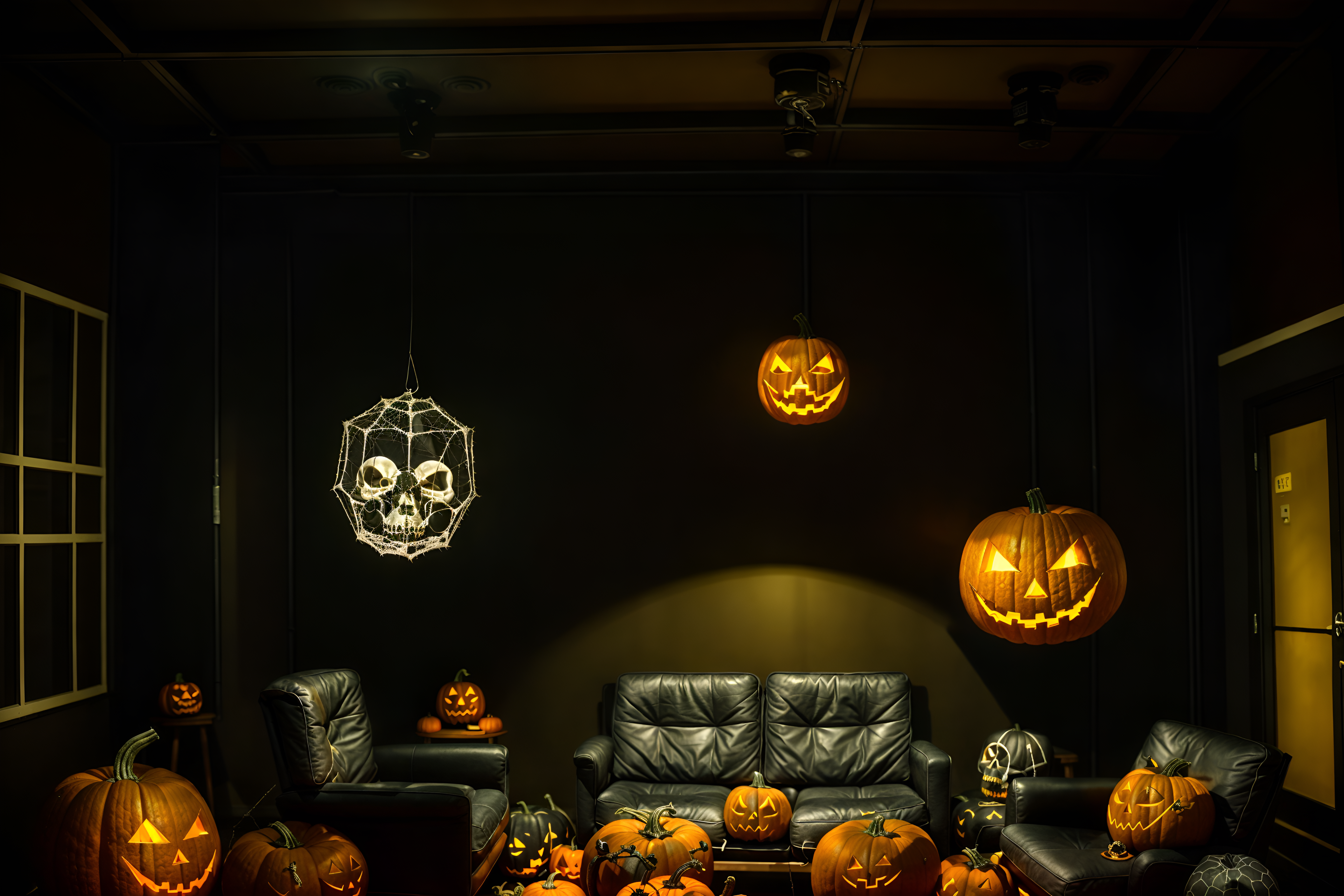 photo from pinterest of halloween-style interior designed (coworking space interior) with lounge chairs and office chairs and office desks and seating area with sofa and lounge chairs. . with glowing pumpkins and cobwebs and human skulls and lanterns and spiderwebs and cobwebs and skeletons sitting and standing and yellow black balloons. . cinematic photo, highly detailed, cinematic lighting, ultra-detailed, ultrarealistic, photorealism, 8k. trending on pinterest. halloween interior design style. masterpiece, cinematic light, ultrarealistic+, photorealistic+, 8k, raw photo, realistic, sharp focus on eyes, (symmetrical eyes), (intact eyes), hyperrealistic, highest quality, best quality, , highly detailed, masterpiece, best quality, extremely detailed 8k wallpaper, masterpiece, best quality, ultra-detailed, best shadow, detailed background, detailed face, detailed eyes, high contrast, best illumination, detailed face, dulux, caustic, dynamic angle, detailed glow. dramatic lighting. highly detailed, insanely detailed hair, symmetrical, intricate details, professionally retouched, 8k high definition. strong bokeh. award winning photo.