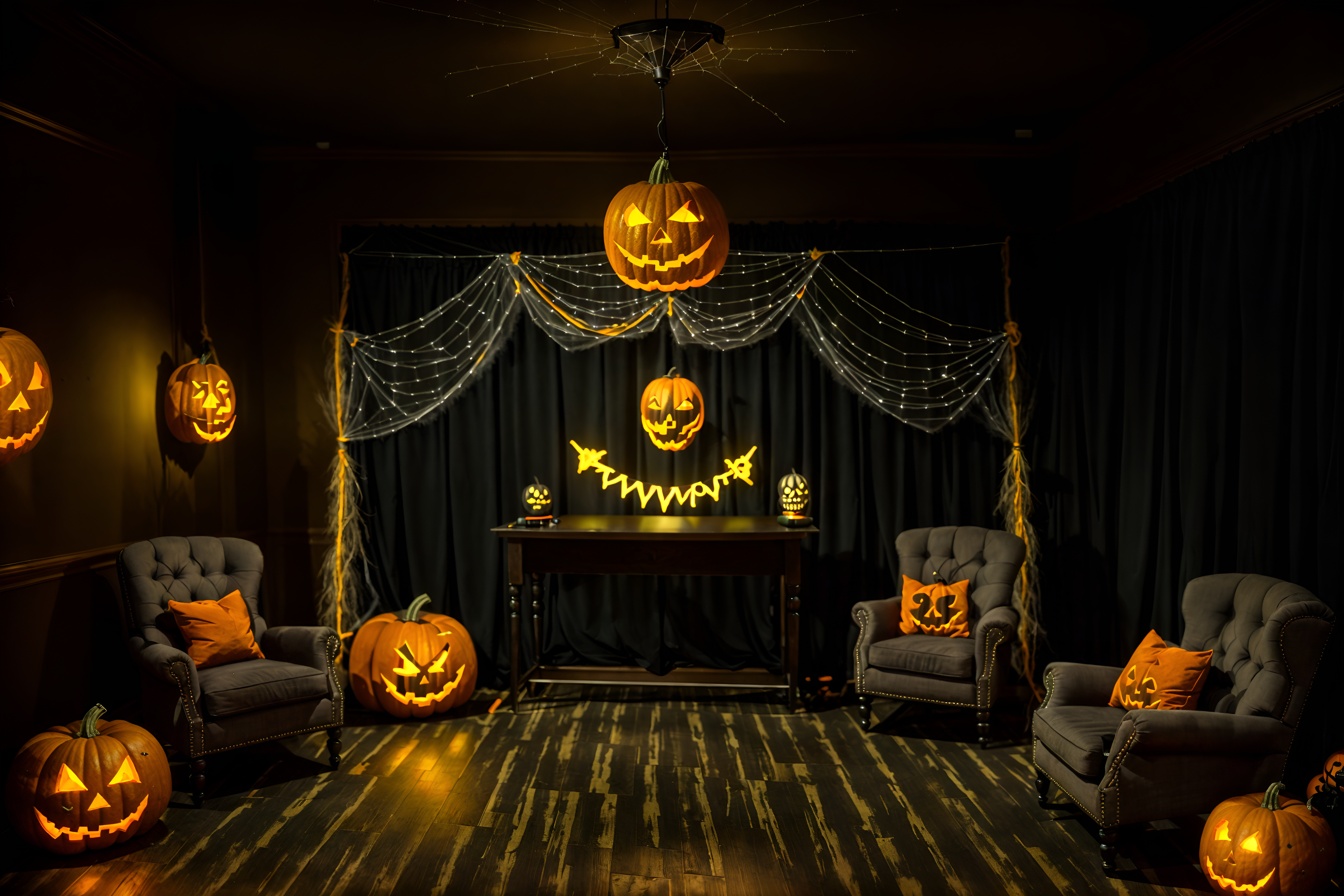 photo from pinterest of halloween-style interior designed (coworking space interior) with lounge chairs and office chairs and office desks and seating area with sofa and lounge chairs. . with glowing pumpkins and cobwebs and human skulls and lanterns and spiderwebs and cobwebs and skeletons sitting and standing and yellow black balloons. . cinematic photo, highly detailed, cinematic lighting, ultra-detailed, ultrarealistic, photorealism, 8k. trending on pinterest. halloween interior design style. masterpiece, cinematic light, ultrarealistic+, photorealistic+, 8k, raw photo, realistic, sharp focus on eyes, (symmetrical eyes), (intact eyes), hyperrealistic, highest quality, best quality, , highly detailed, masterpiece, best quality, extremely detailed 8k wallpaper, masterpiece, best quality, ultra-detailed, best shadow, detailed background, detailed face, detailed eyes, high contrast, best illumination, detailed face, dulux, caustic, dynamic angle, detailed glow. dramatic lighting. highly detailed, insanely detailed hair, symmetrical, intricate details, professionally retouched, 8k high definition. strong bokeh. award winning photo.